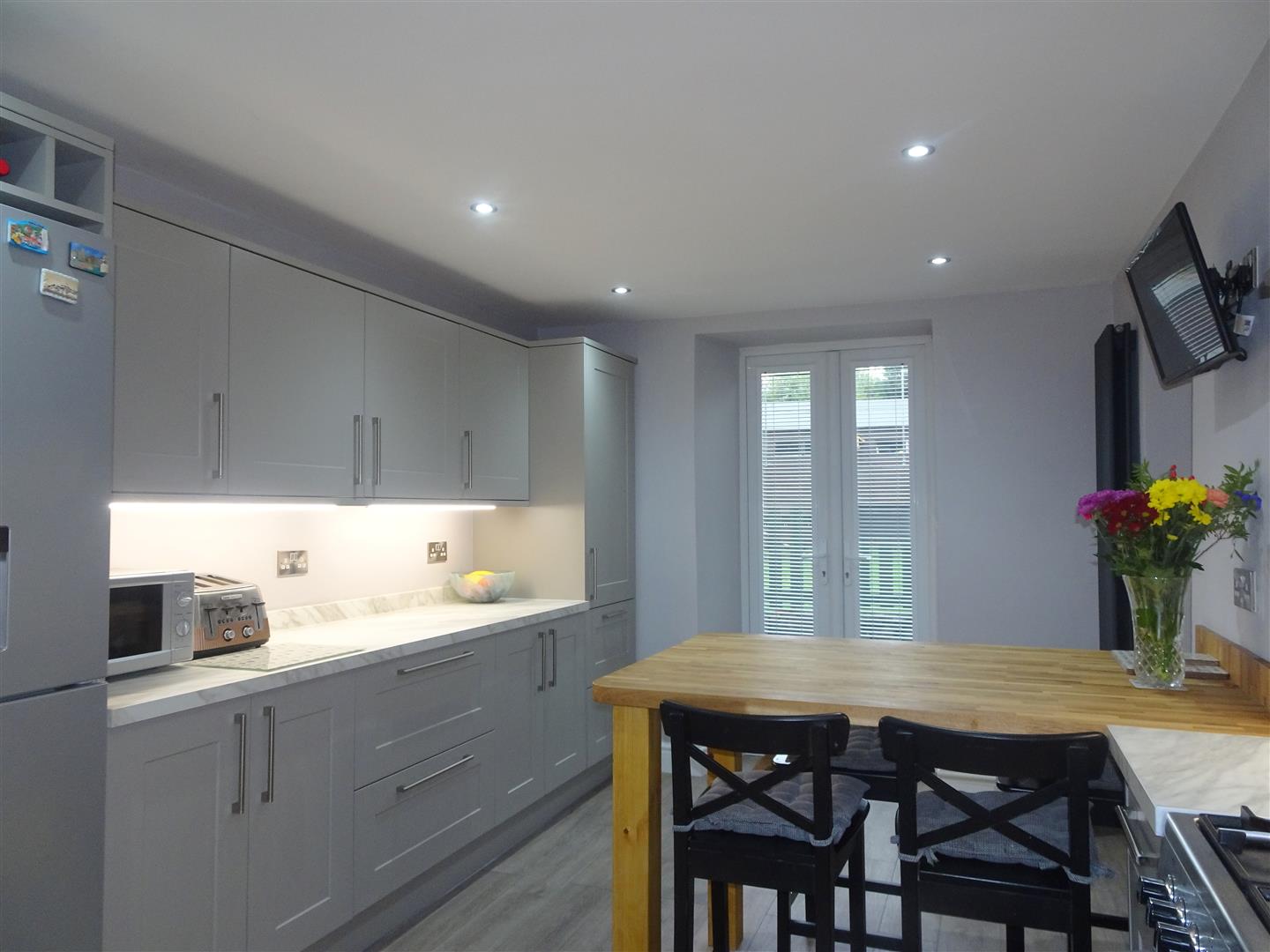 with range of newly fitted wall and base units in "Pebble" colour, including 1½ bowl stainless steel sink unit, plumbing for dishwasher, oak breakfast bar, marble effect work surfaces and tiled surrounds, space for range cooker, extractor hood over, grey wash oak effect vinyl flooring, uPVC double glazed "French" doors into the garden, entrance porch off