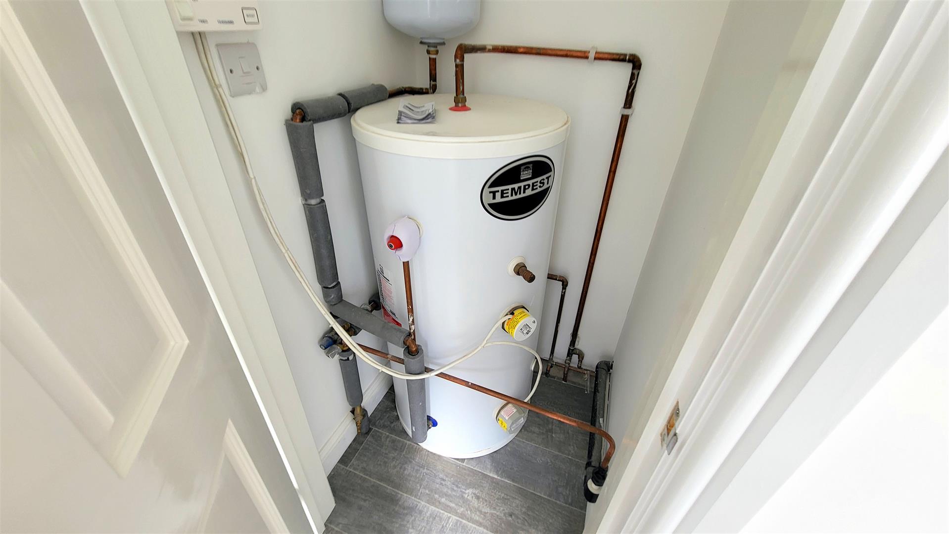 Modern white bathroom suite comprising rectangular bath with Triton overhead shower; sink; W/C; grey linoleum flooring; 2 x uPVC windows with modesty glass; cupboard housing Tempest hot water cylinder.