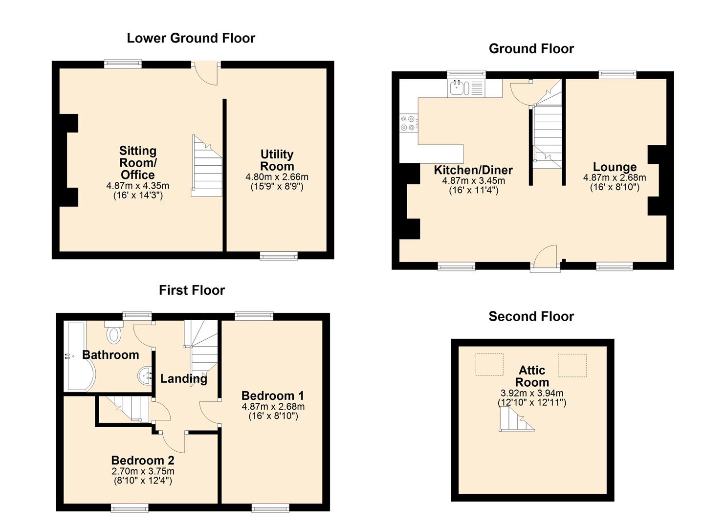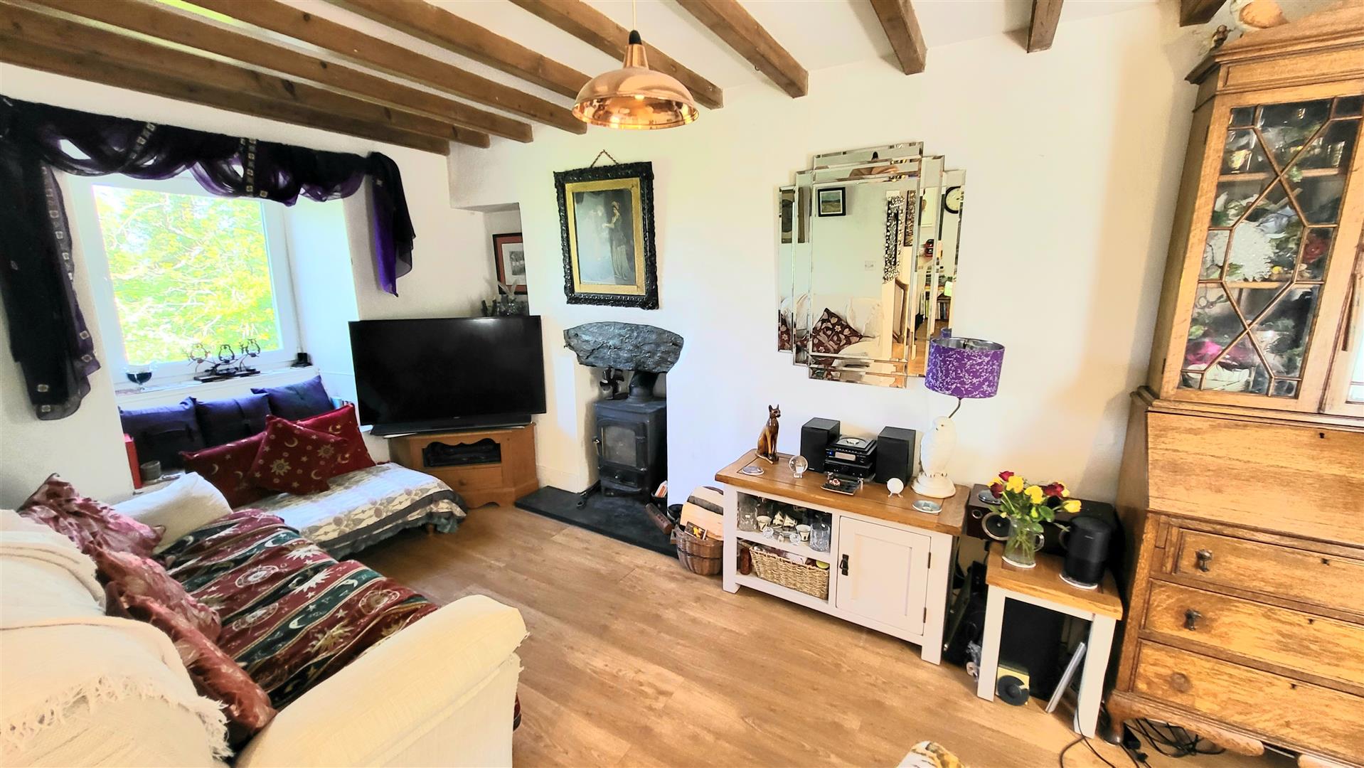 Dual aspect windows to front and rear with far reaching sea and countryside views, log burning stove, original ceiling beams, radiator, stairs leading to