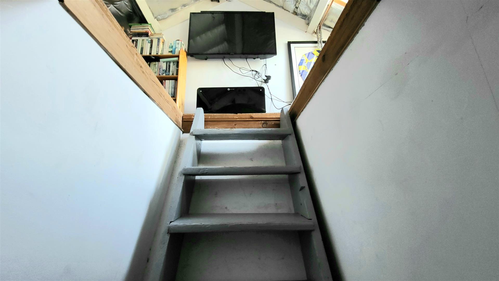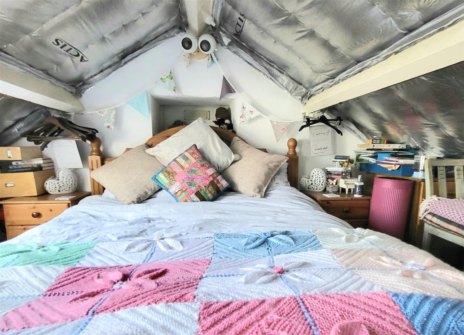 Steps from landing to large flexible attic space, currently being used as an occasional bedroom, two skylight windows to rear