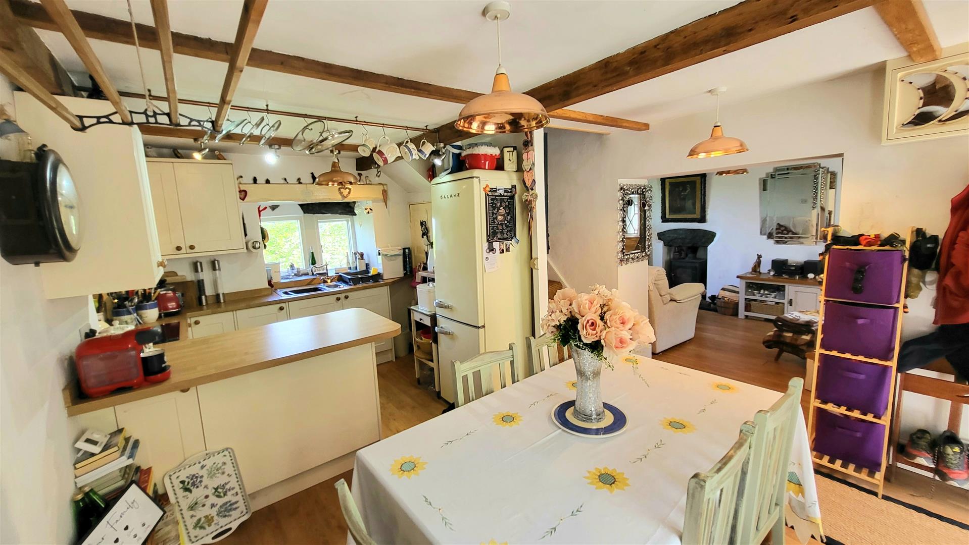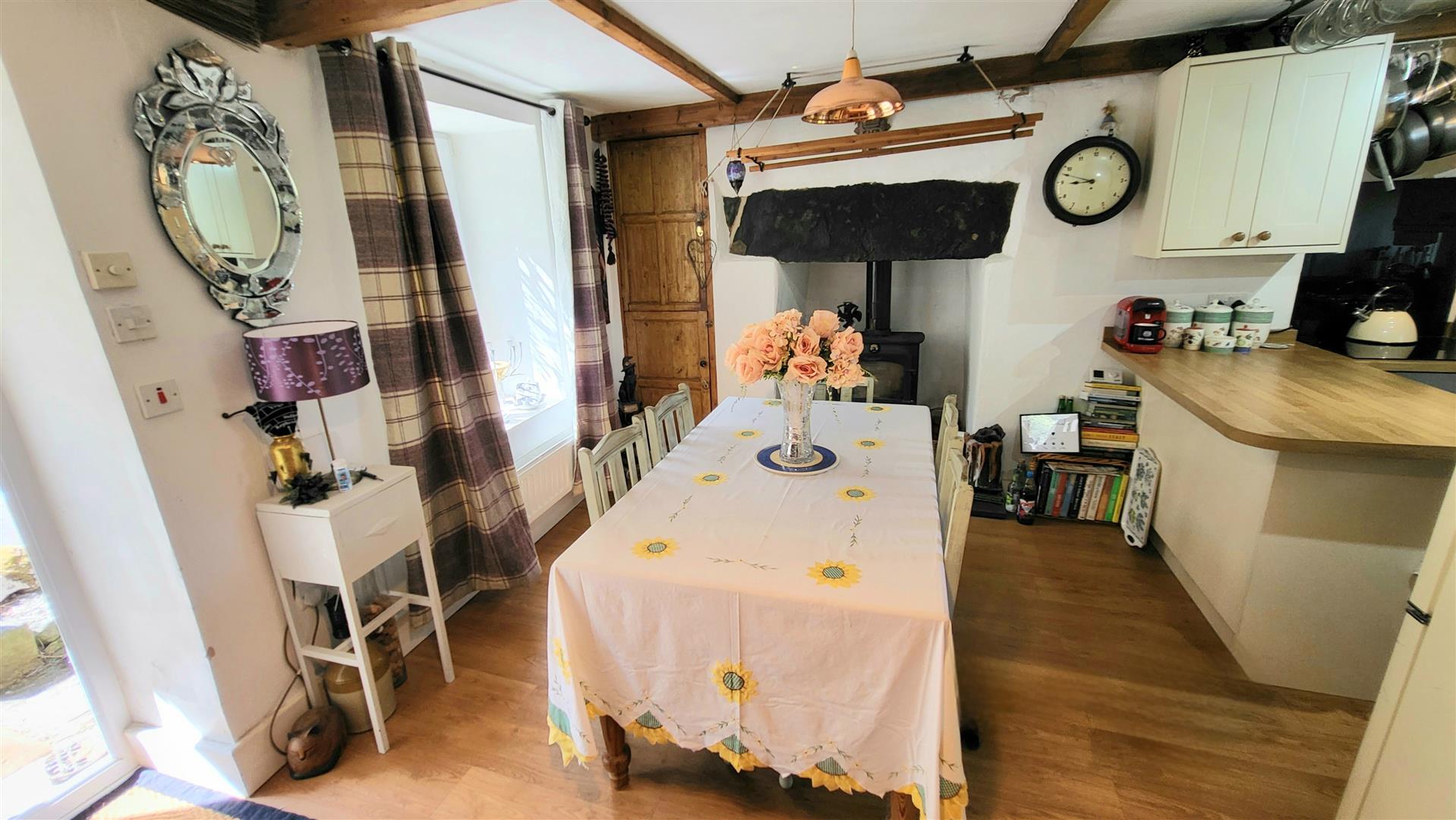 Open plan room with kitchen at far end comprising wall and base units with 1 1/2 sink and drainer, space for fridge/freezer, electric cooker with hob above and glass splash back, breakfast bar, window to rear, ceiling beams, door leading to lower ground floor - dining area to front with log burning stove, original cupboards to side, window to front aspect, radiator, open to