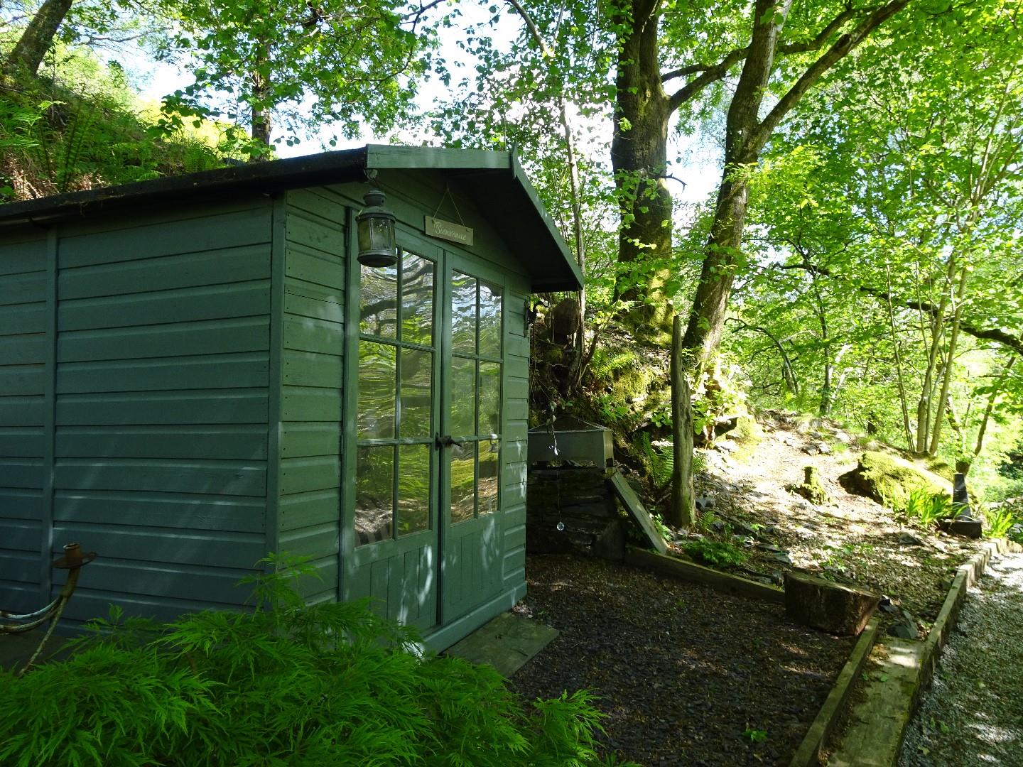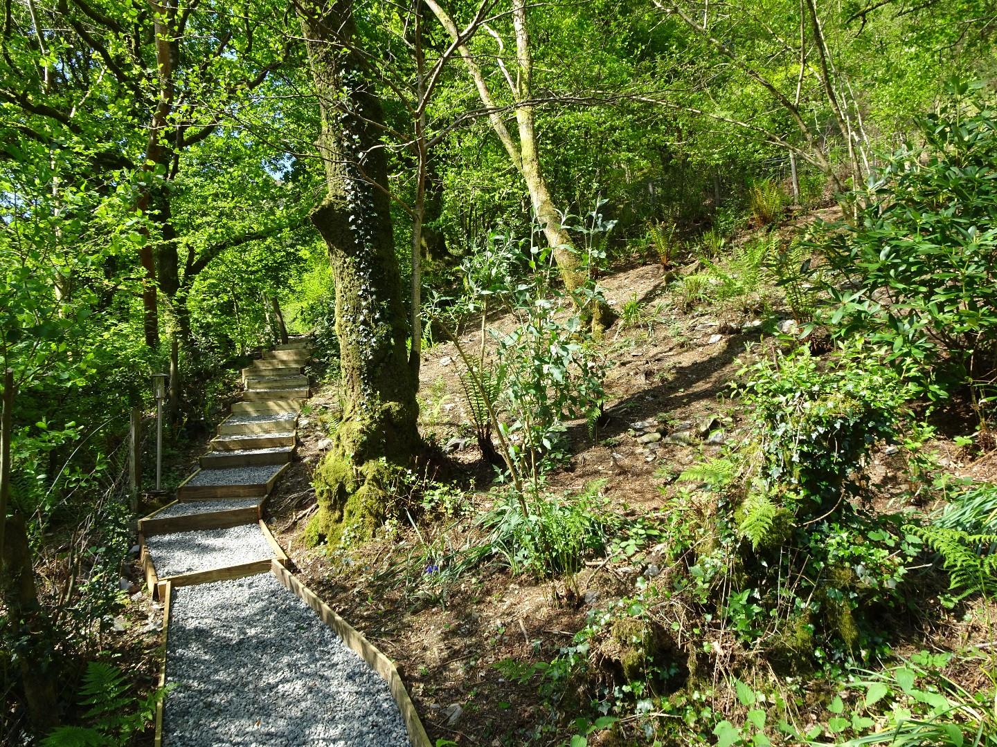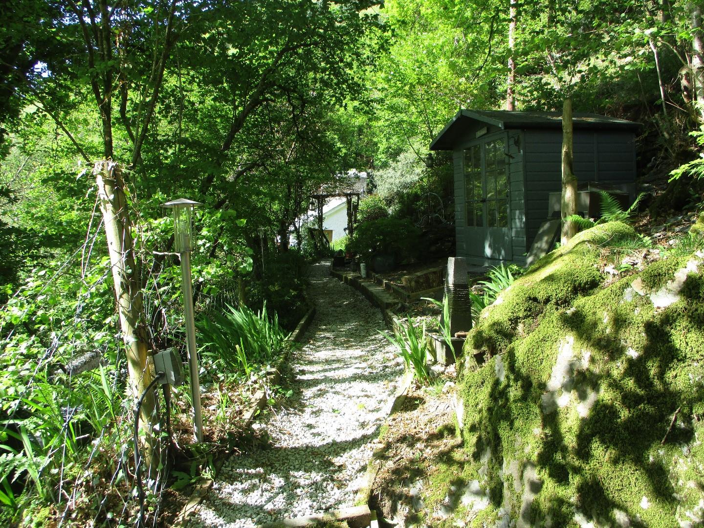 Extensive woodland garden with mature trees, a variety of shrubs and plants, slate paved and gravelled paths, paved patio, ornamental fish pond, timber summer house, timber shed with light and power connected, oil storage tank.; outside lighting; elevated garden beyond enjoying magnificent views