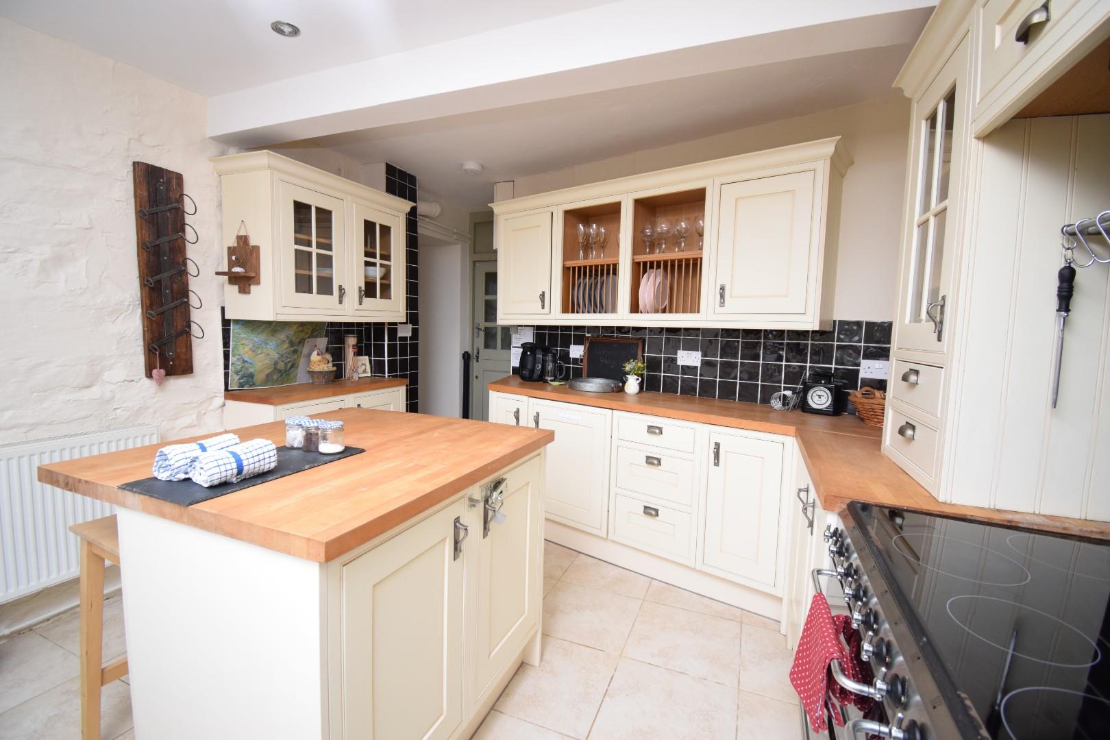 with range of Country style wall and base units including 1½ bowl sink unit, plate rack, glass fronted wall units, central island, integrated fridge, recess fitted with electric cooking range (included in the sale) plumbing for dishwasher and washing machine, wooden work surfaces, tiled surrounds, tiled floor, radiator, stable type doors opening to the front and rear