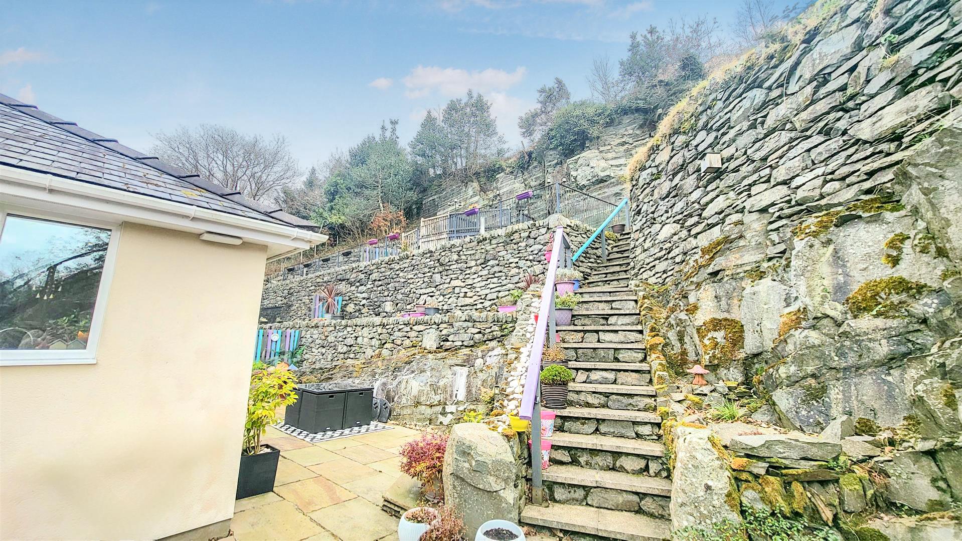 To the rear there is an unique terraced garden with feature rock backdrop. Steps lead from a paved patio with external lighting to a lawned garden and wildflower area and then continue to a wooden decking area providing elevated views of Harlech.