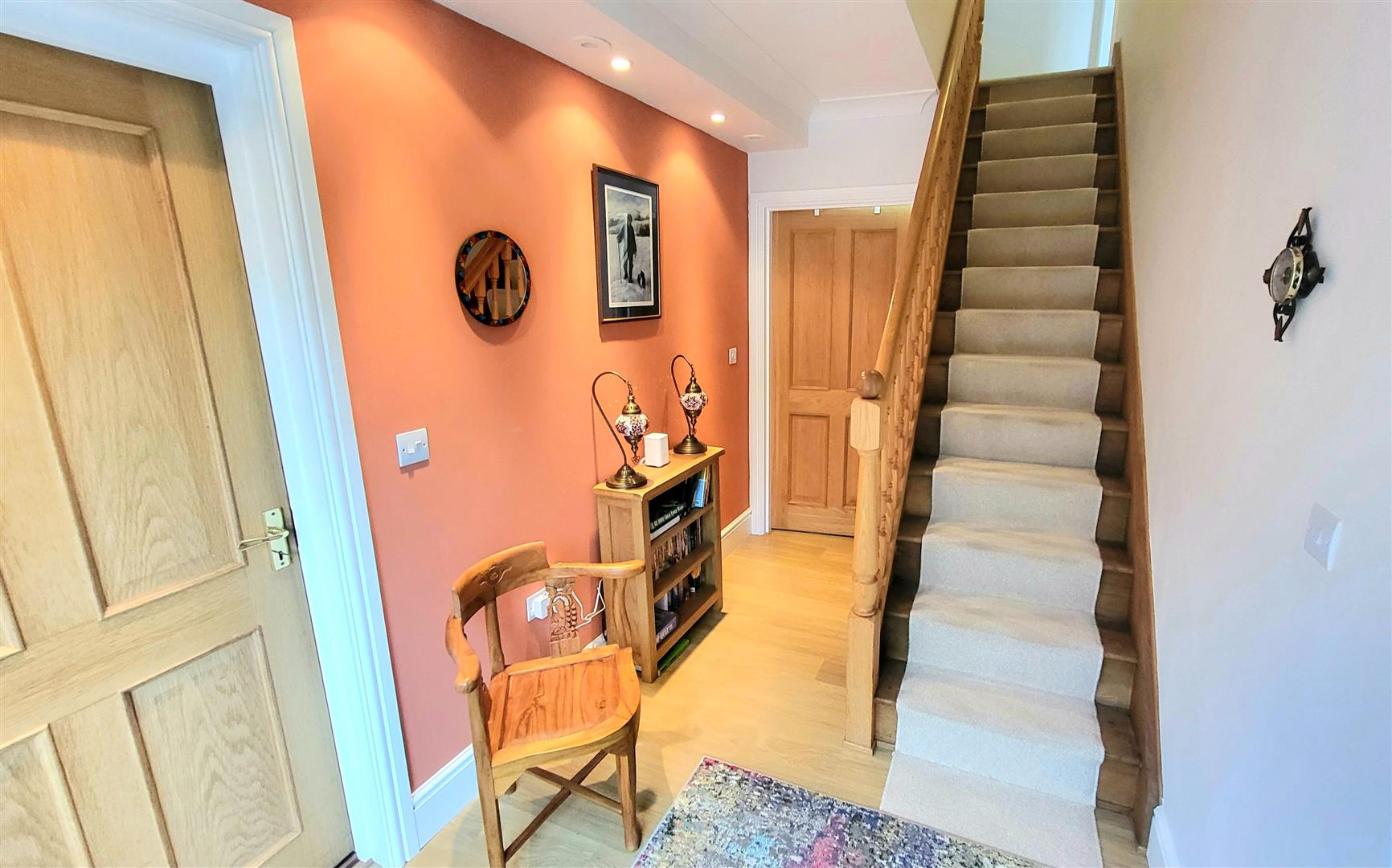 Engineered wooden flooring, ceiling spotlights, carpeted stairs to first floor, door into garage, doors into