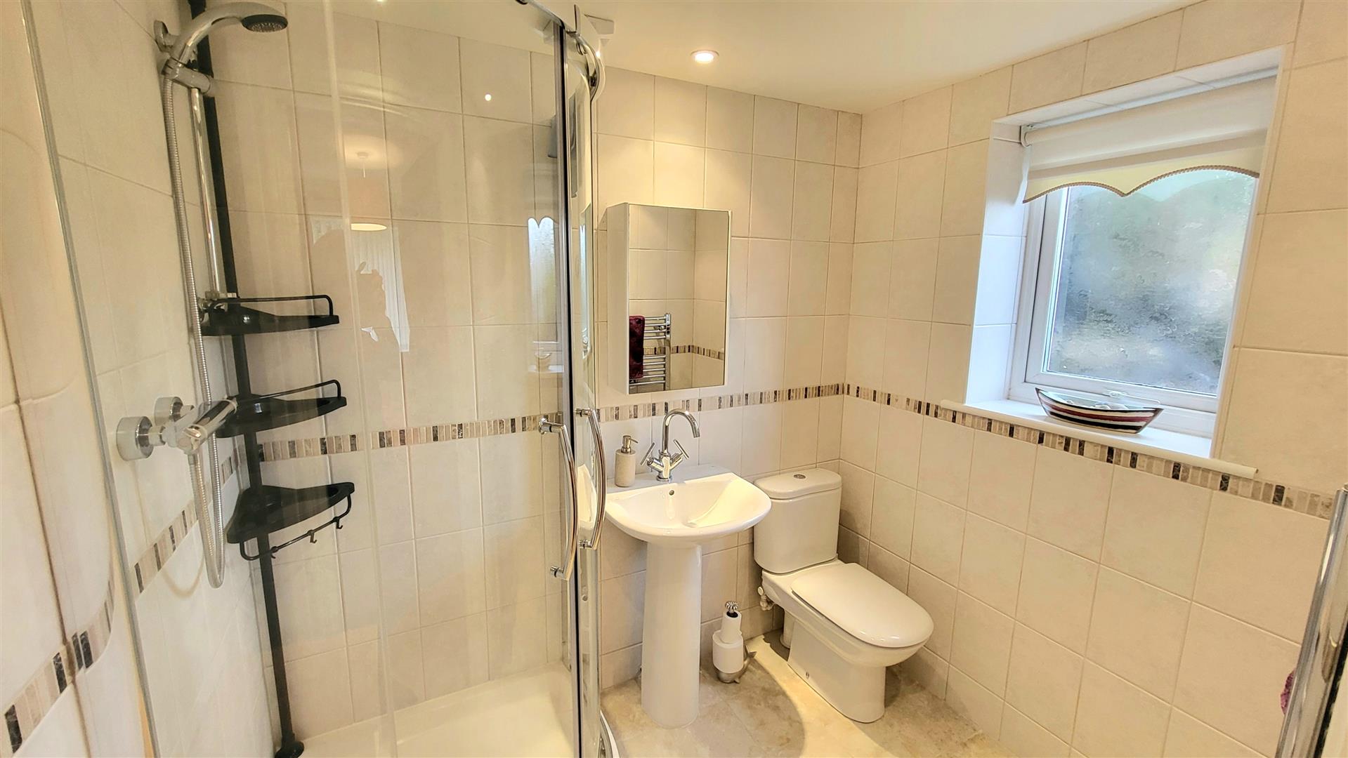 White suite comprising of corner shower unit, low level W.C., wash hand basin, fully tiled walls and floor, heated towel rail, shaving point and mirror