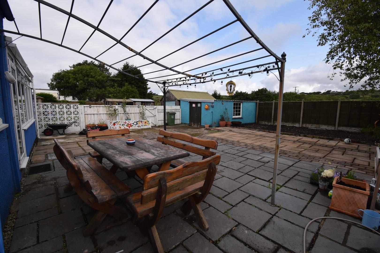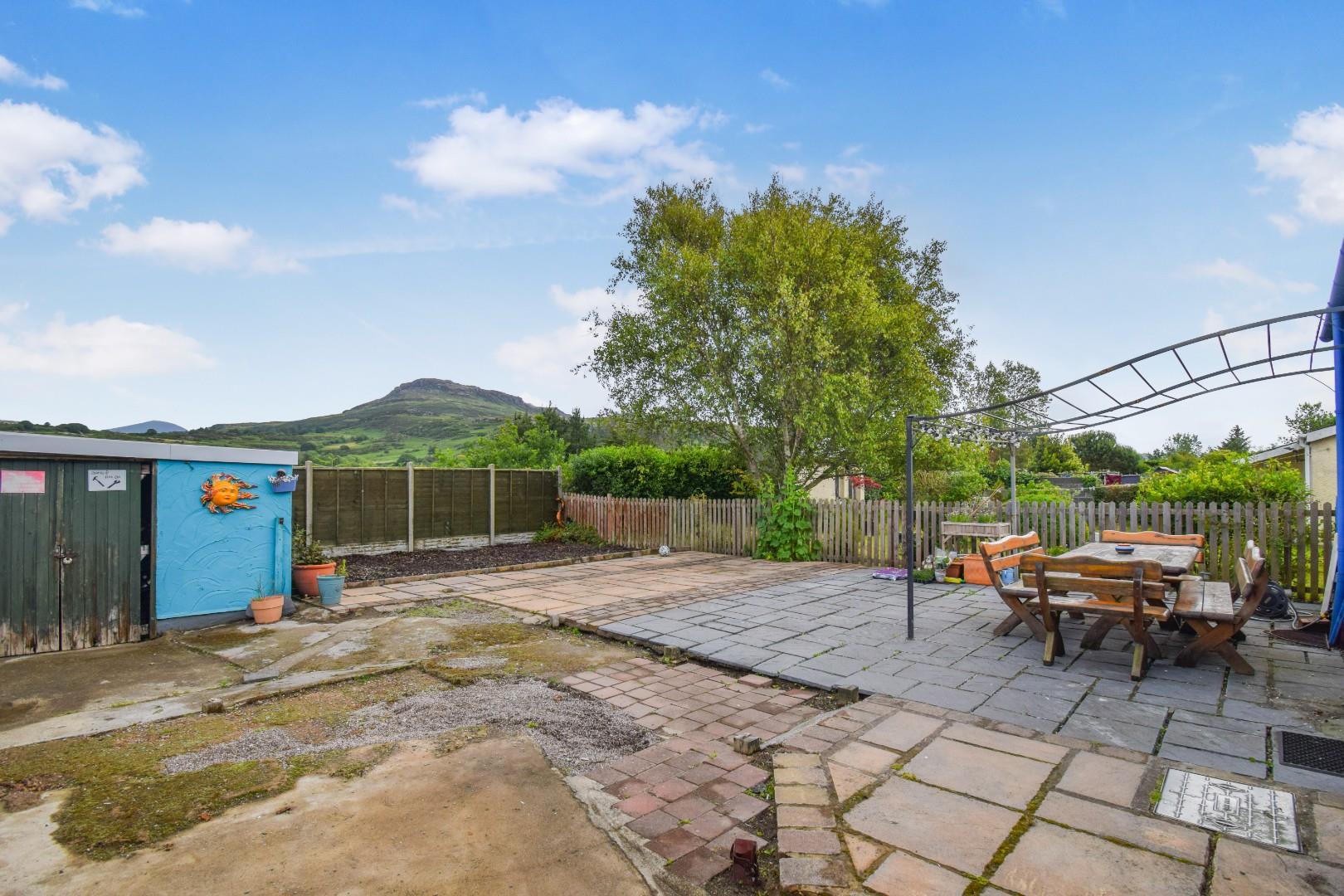 At the rear there is a large garden laid to concrete and paving, with fantastic views towards Moel Y Gest at the rear. There is a large brick store/garage at the rear of the garden and a timber storage shed to the side of the house. At the back of the kitchen there is a patio with framework for a covered veranda.