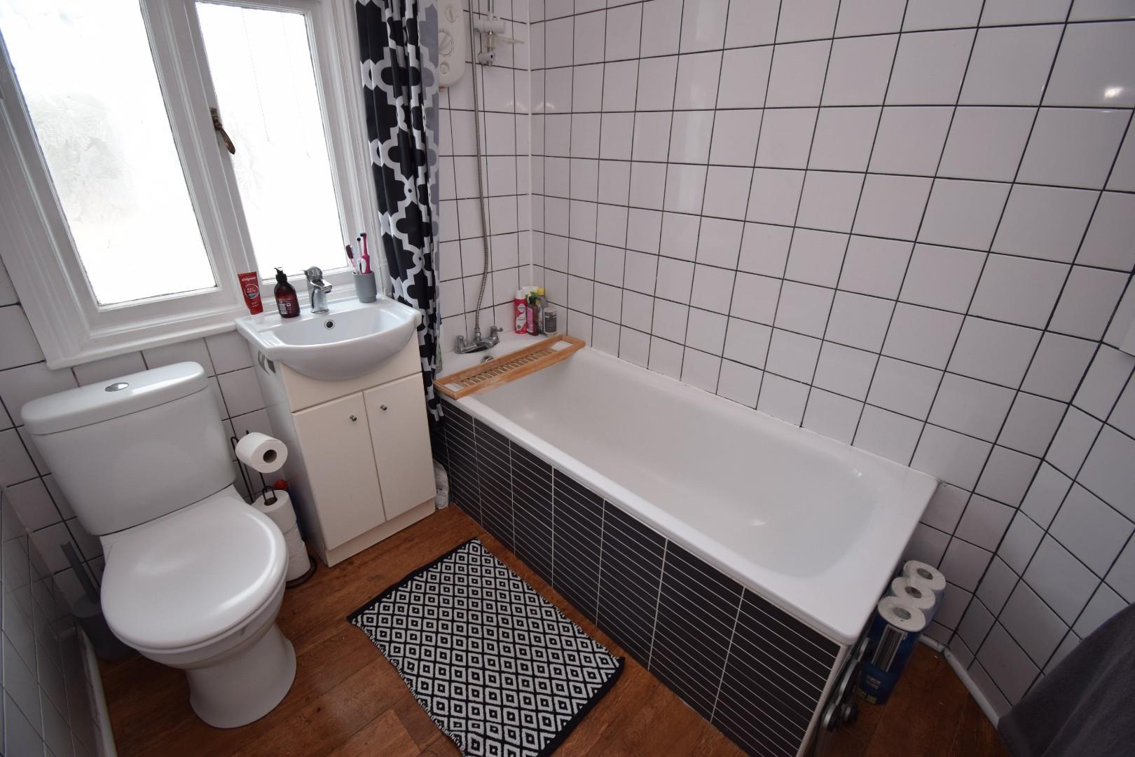 with panelled bath with shower over; low level WC; wash basin with vanity and radiator