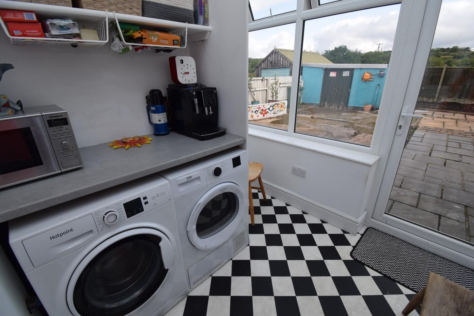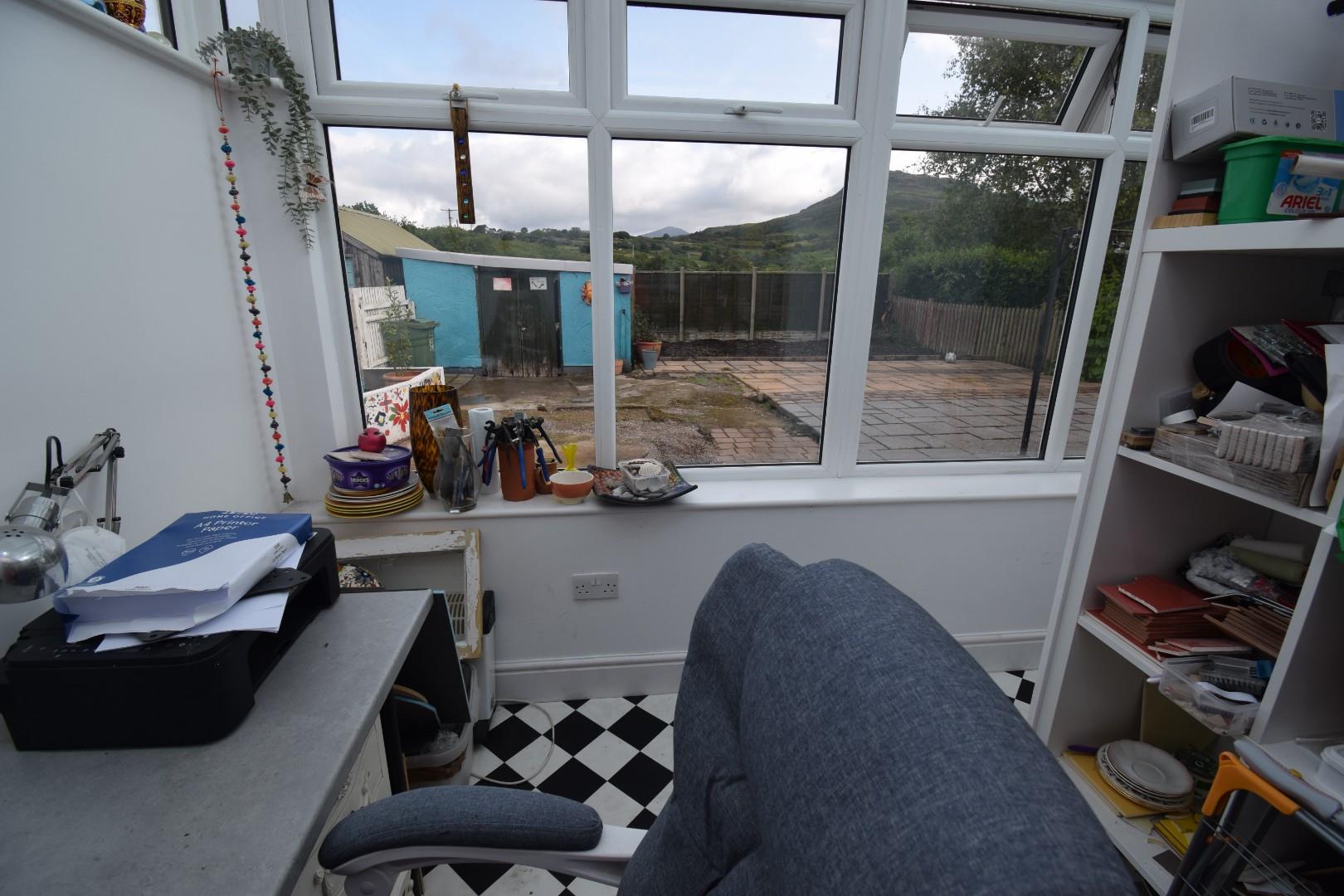 with split areas featuring utlity area with space and plumbing for washing machine and tumble dryer with worktop over and a home office to the other side; door to garden and fantastic views towards Moel Y Gest