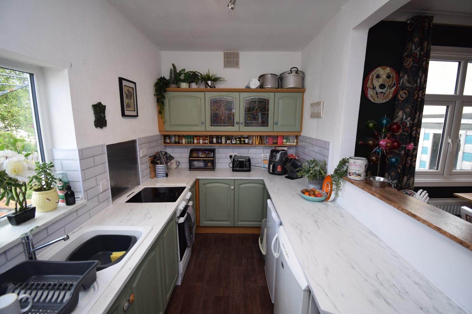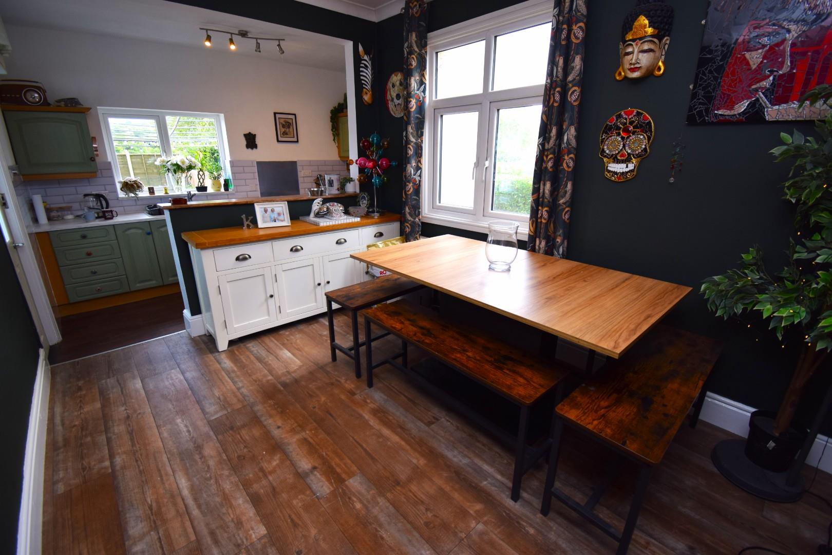 with a range of built in wall and base units with worktop over; space for free standing electric oven; composite sink and drainer and space for under counter fridge and freezer. The dining area is set a little higher and benefits from a window to the side and timber effect vinyl flooring