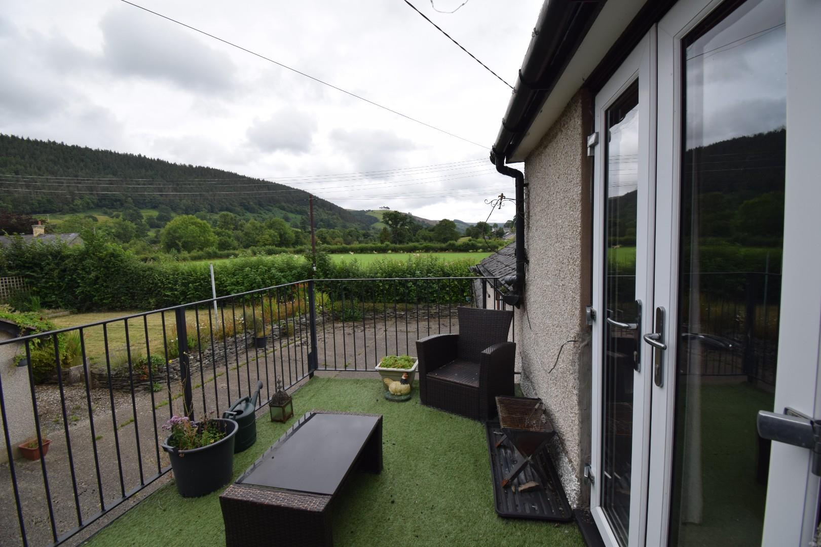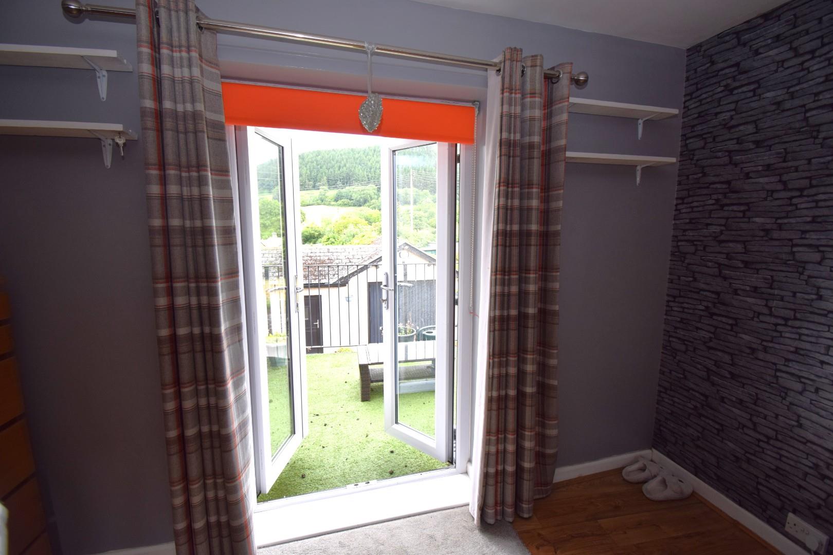 Spacious bedroom with dual aspect which includes double glazed French doors opening to a raised decked seating area / balcony. Stunning views towards the Berwyn hills and village. Wood grained effect flooring and 1 radiator.