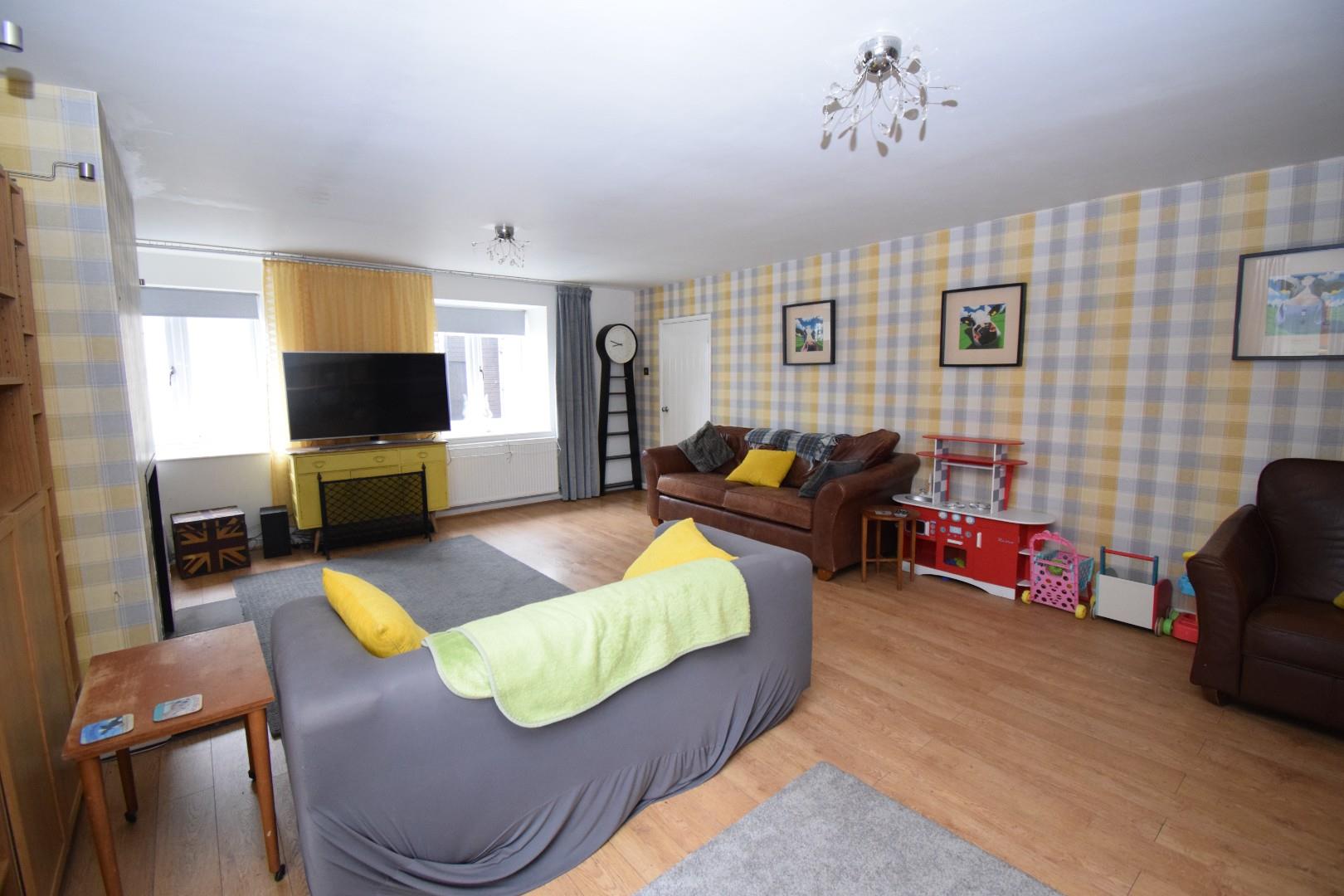 Large and spacious lounge, dual aspect, lined fireplace housing a multi fuel stove on a raised hearth, oak laminated flooring and 2 radiators.
