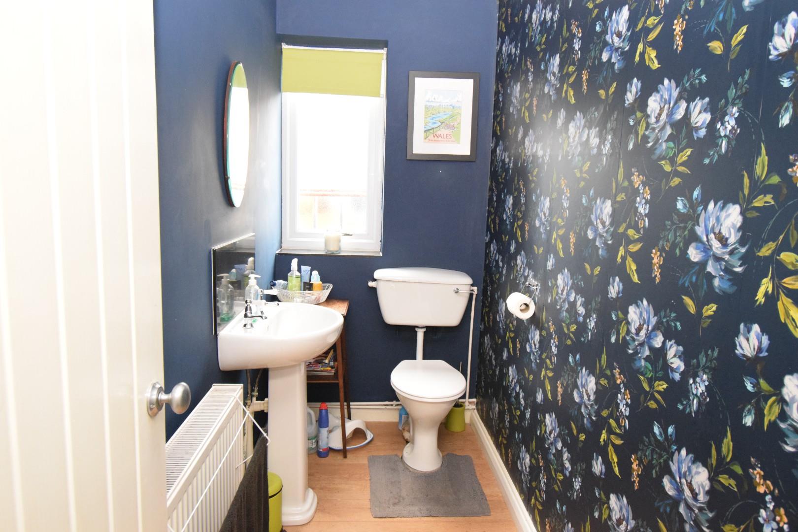 with pedestal hot and cold wash hand basin, wc, window, wood effect laminated flooring and 1 radiator.