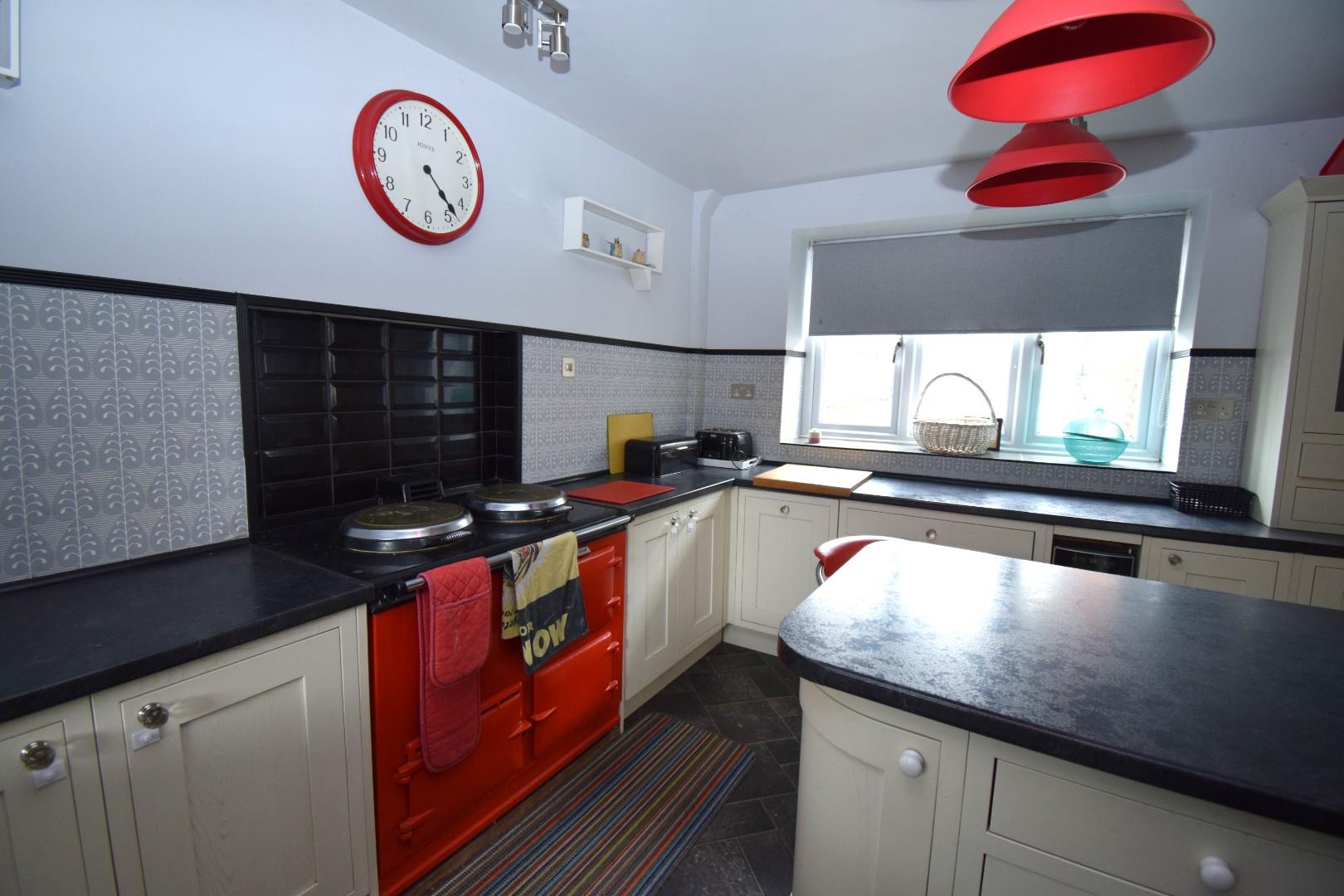 With a red enamelled oil fired AGA, twin hot plates and ovens, matching wall and base cupboards, stone effect work surfaces, white glazed sink with mixer tap and drainer. Integrated dishwasher and wine cooler, central breakfast bar, downlights, dual aspect windows, tile effect vinyl flooring extending into inner lobby and understairs area.