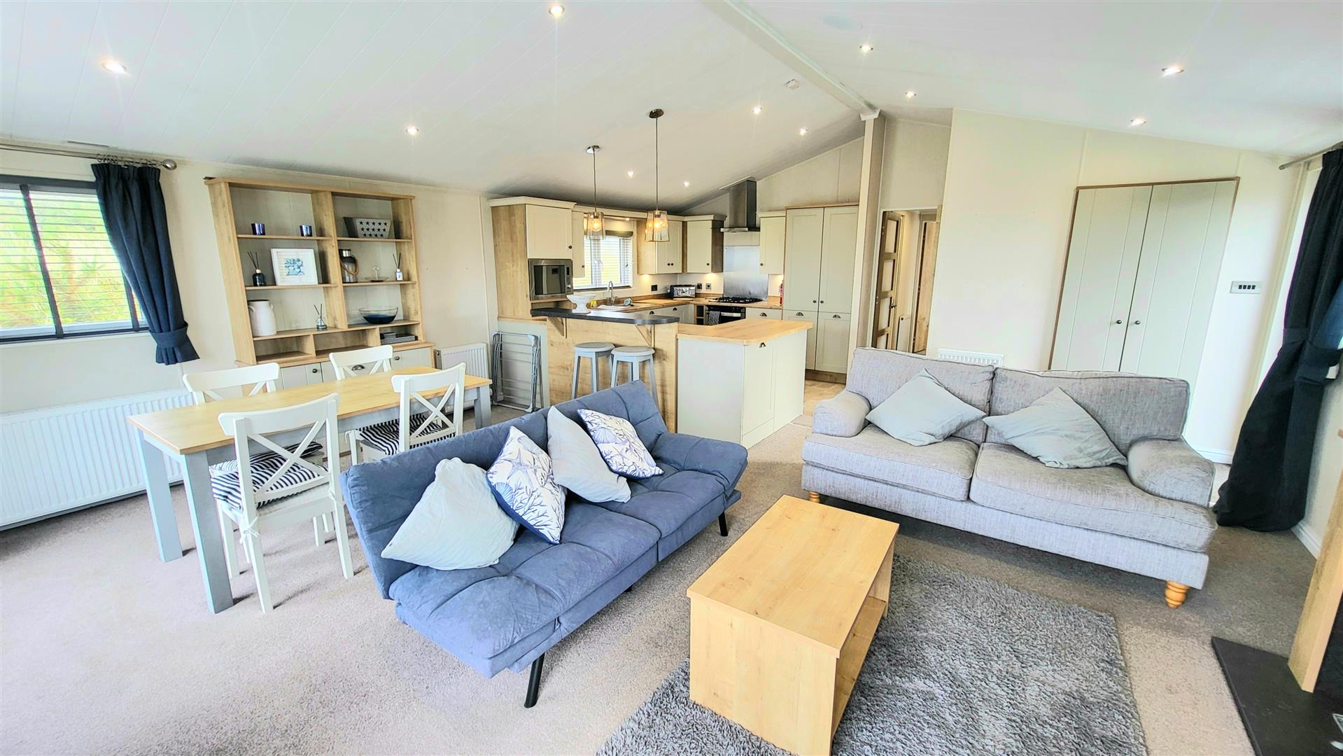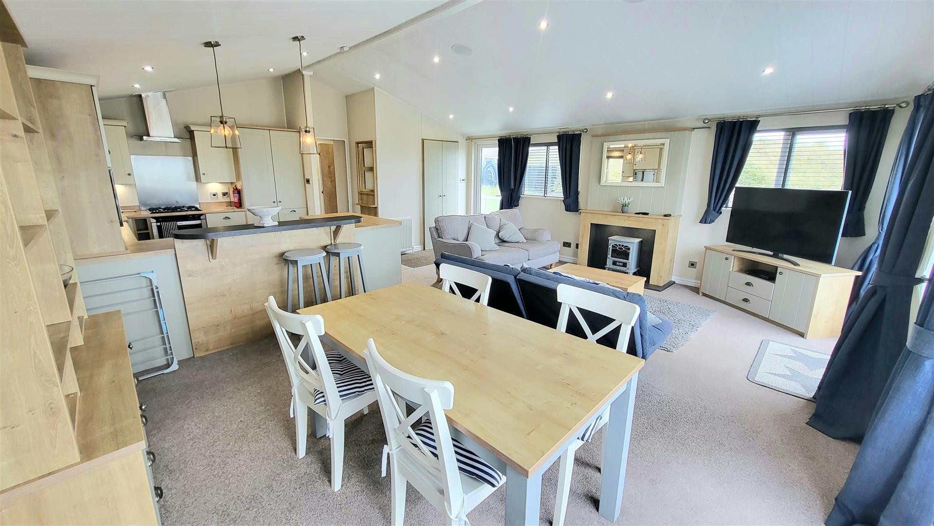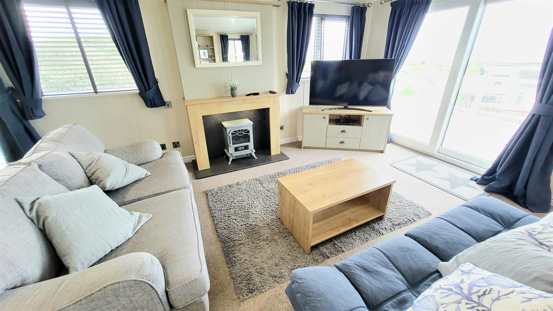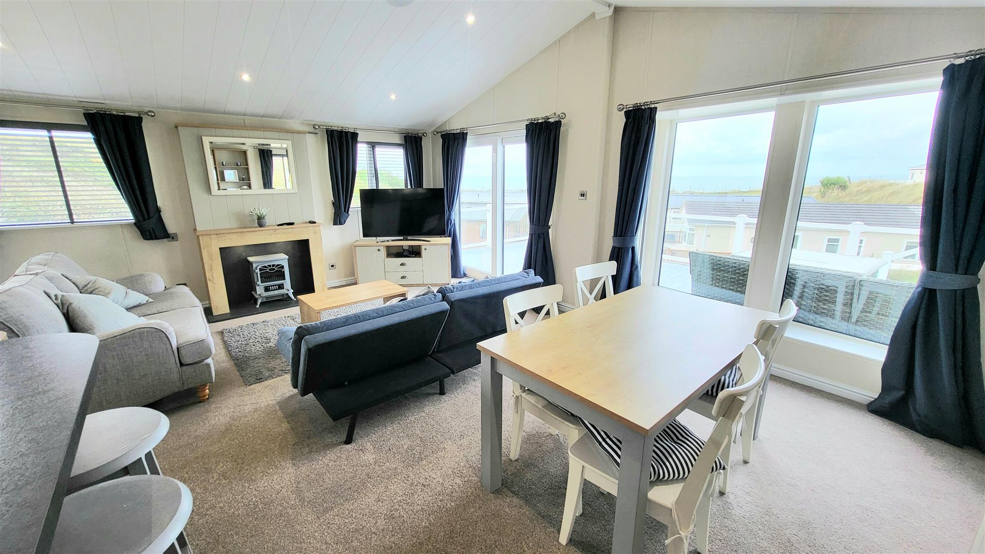 Carpeted, feature fireplace, windows to sides and patio doores to decking area, four uPVC windows, radiators x 3, breakfast bar.