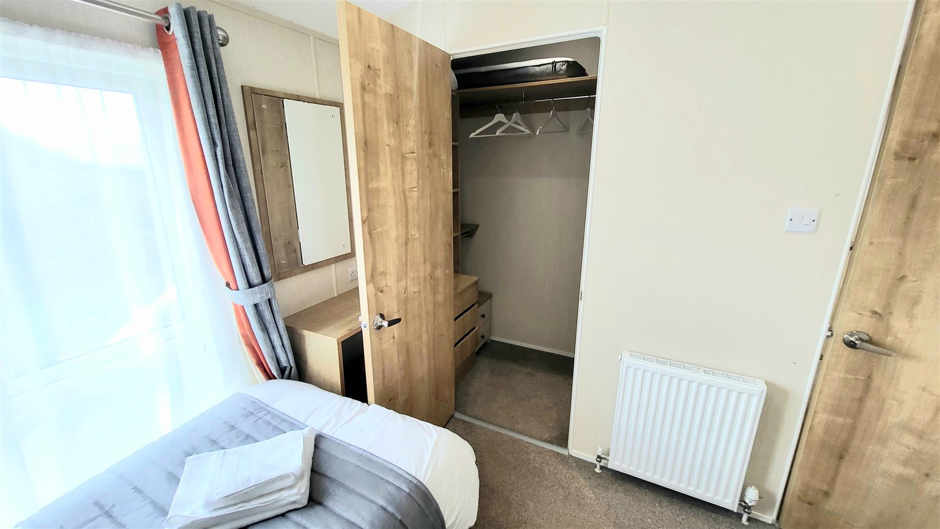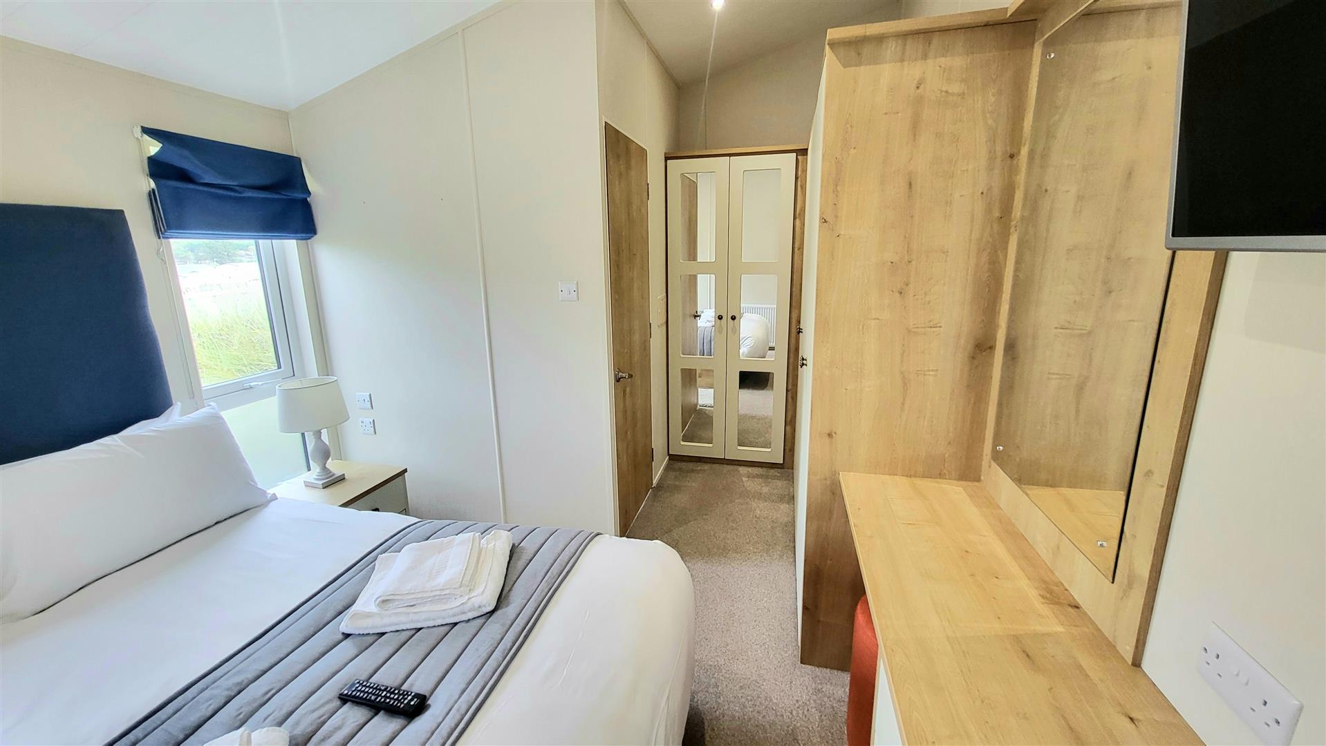 Carpeted, quadruple fitted wardrobe unit, double fitted wardrobe unit with glass doors,additional storage cupboard above bedroom door, fitted double bed and bedside cabinets, drassing table with mirror. 2 x uPVC windows, TV point.