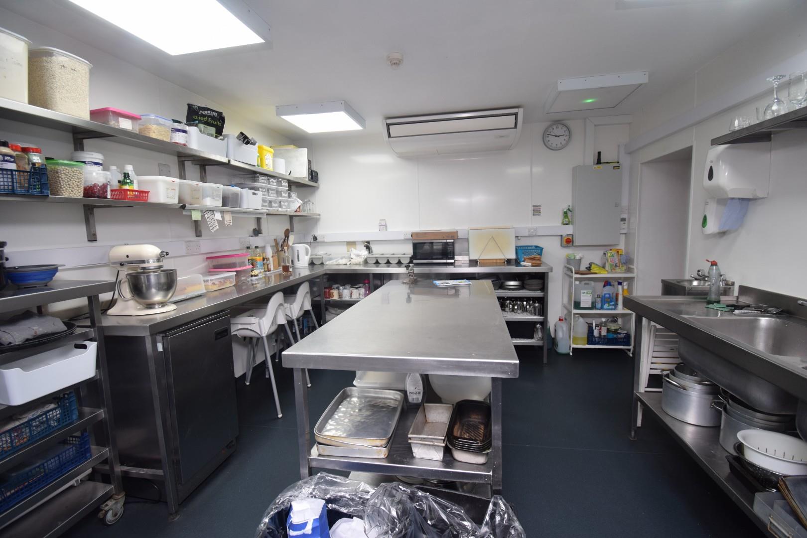 with a range of stainless steel kitchen worktops and appliances, including but not exclusively, ovens, dishwashers, microwaves; fryers; fridges etc within fully equipped kitchen; panelled walls; HVAC system and door to rear