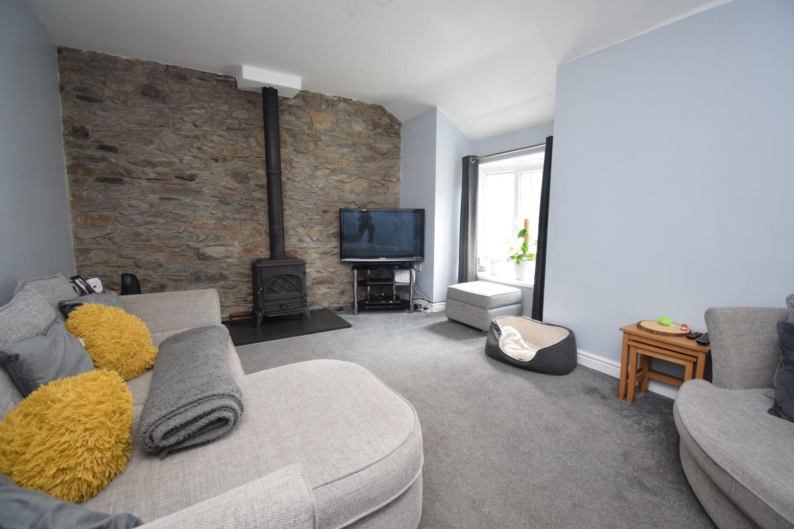 with feature stone wall and log burning stove; carpet flooring; far reaching countryside views and 'jack and jill' style door with access to bedroom 2
