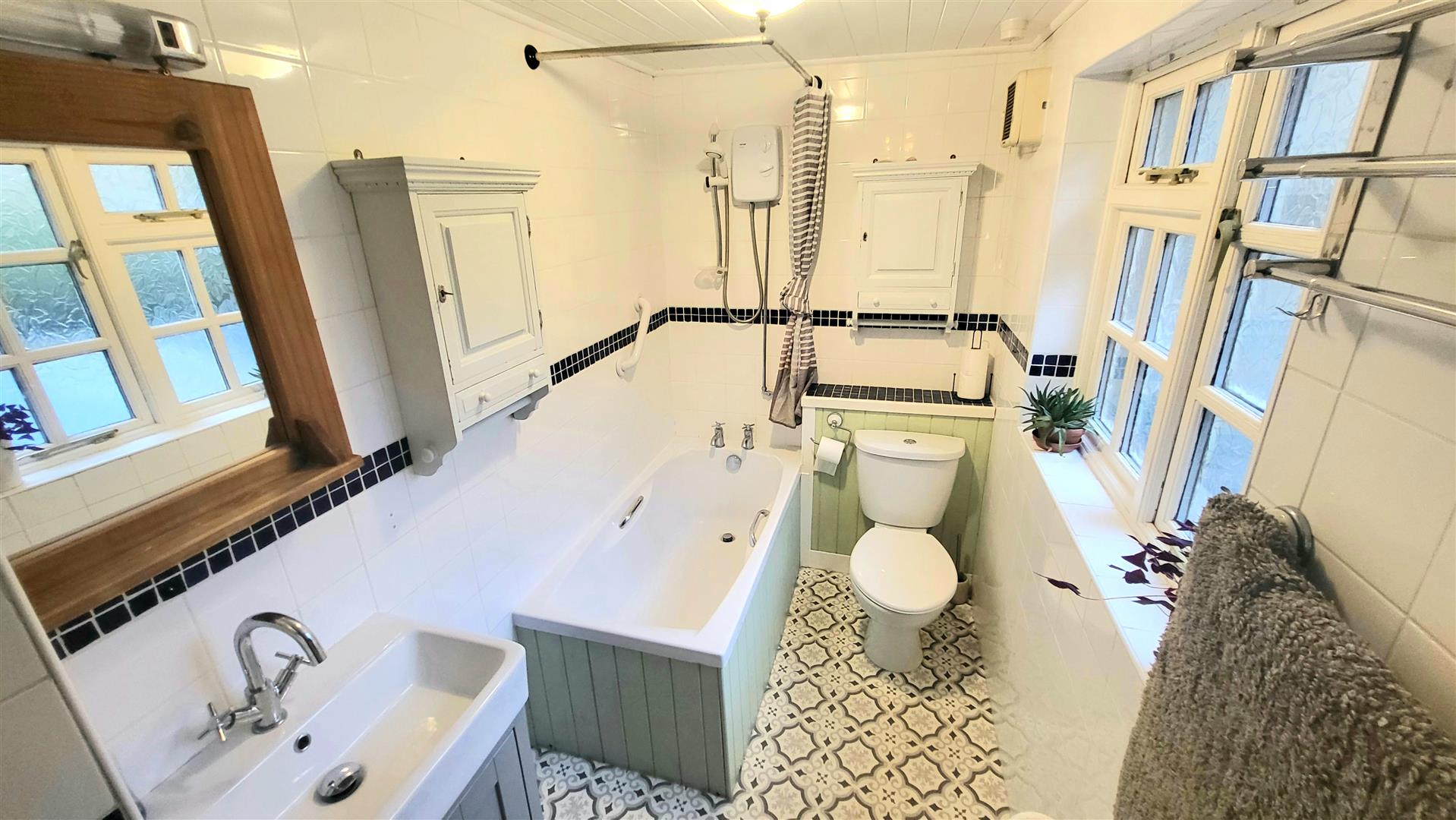 Fitted with suite comprising panelled bath with electric "Triton Reba" shower above, low level w.c., wash hand basin with cupboards below, fully tiled walls, electric storage heater, obscured window to side