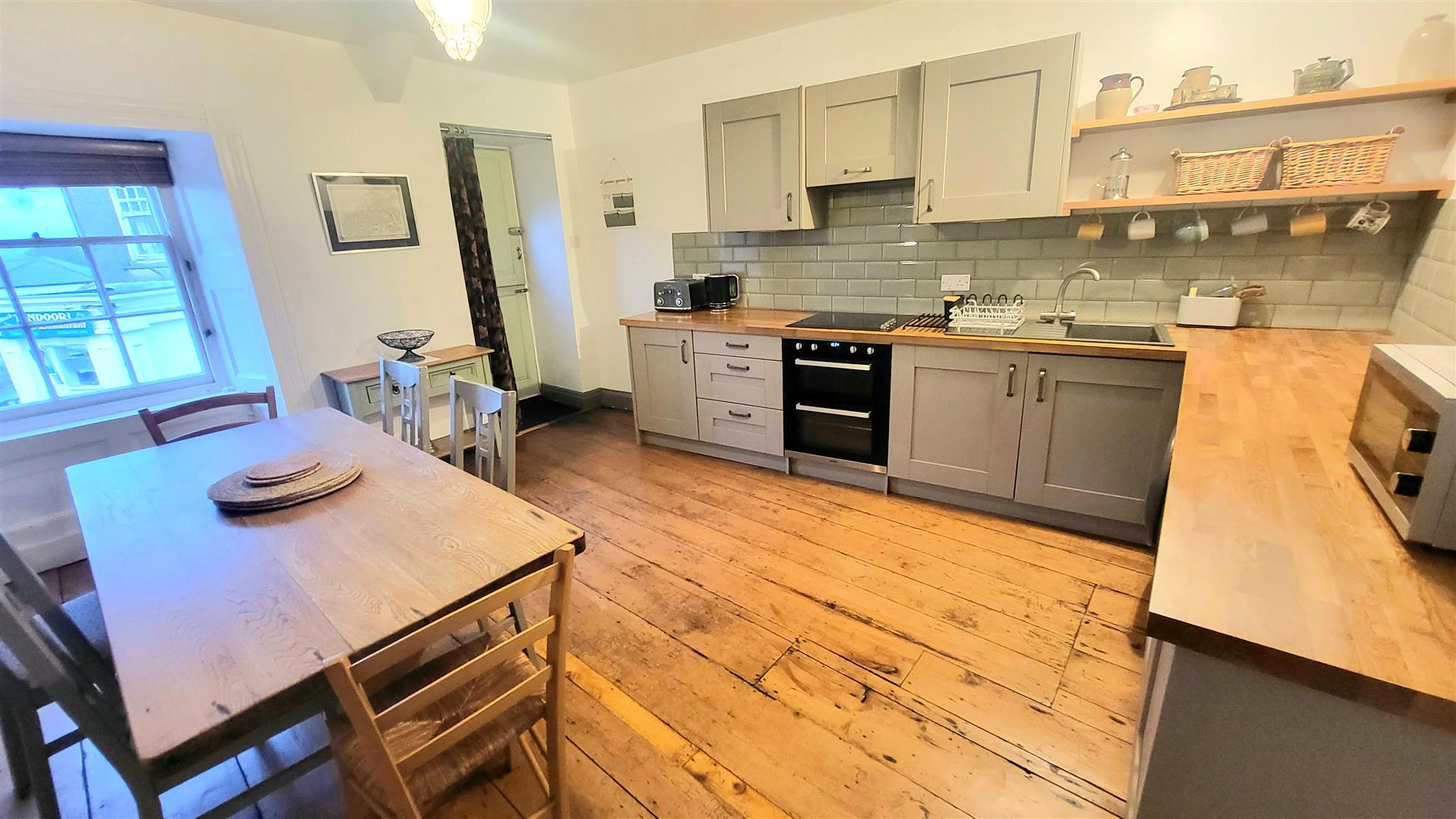 Solid wooden flooring, electric storage heater, fitted range of eye-level and floor-standing units with oak worktops, space for washing machine, integrated electric oven with hob and extractor hood above, composite sink and drainer unit with mixer tap, tiled splashbacks, window to side aspect with far reaching mountain views, door to inner hallway