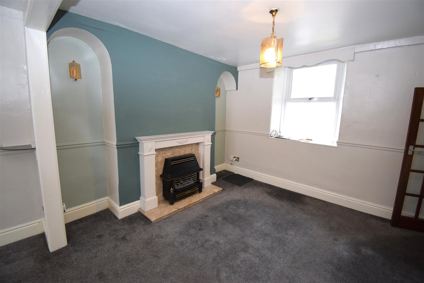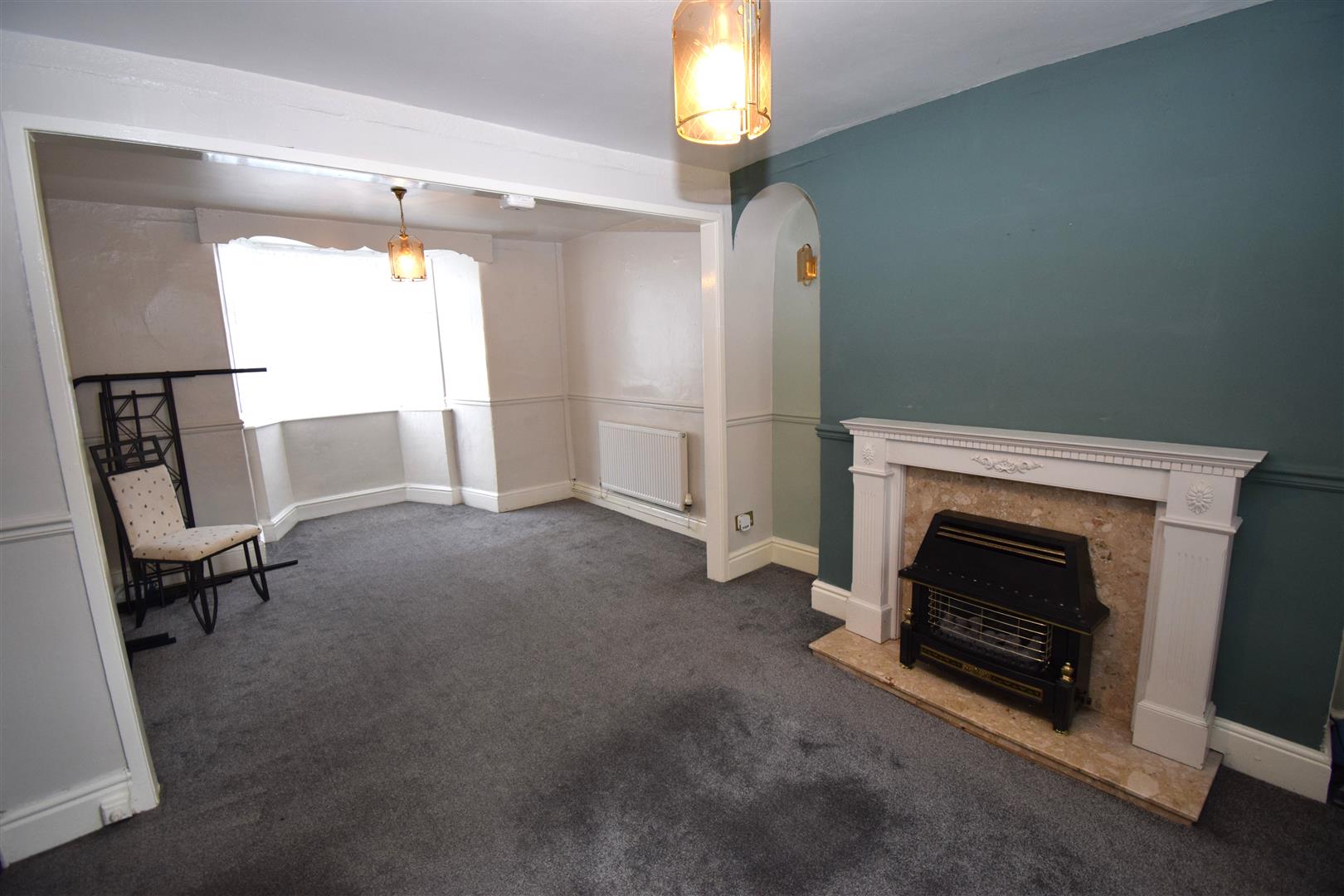 with bay window, timber surround fireplace, marble inset and hearth fitted with coal effect gas fire, radiator