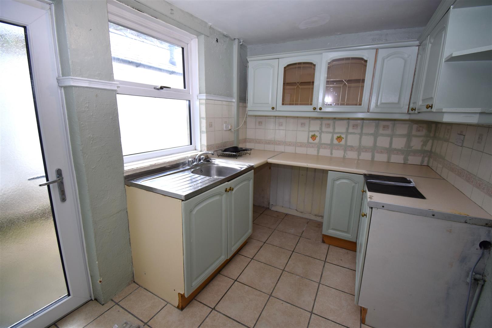 with range of wall and base units including single drainer stainless steel sink unit, work surfaces, tiled surrounds, plumbing and space for washing machine, cooker point, radiator, tiled floor, uPVC double glazed door to rear