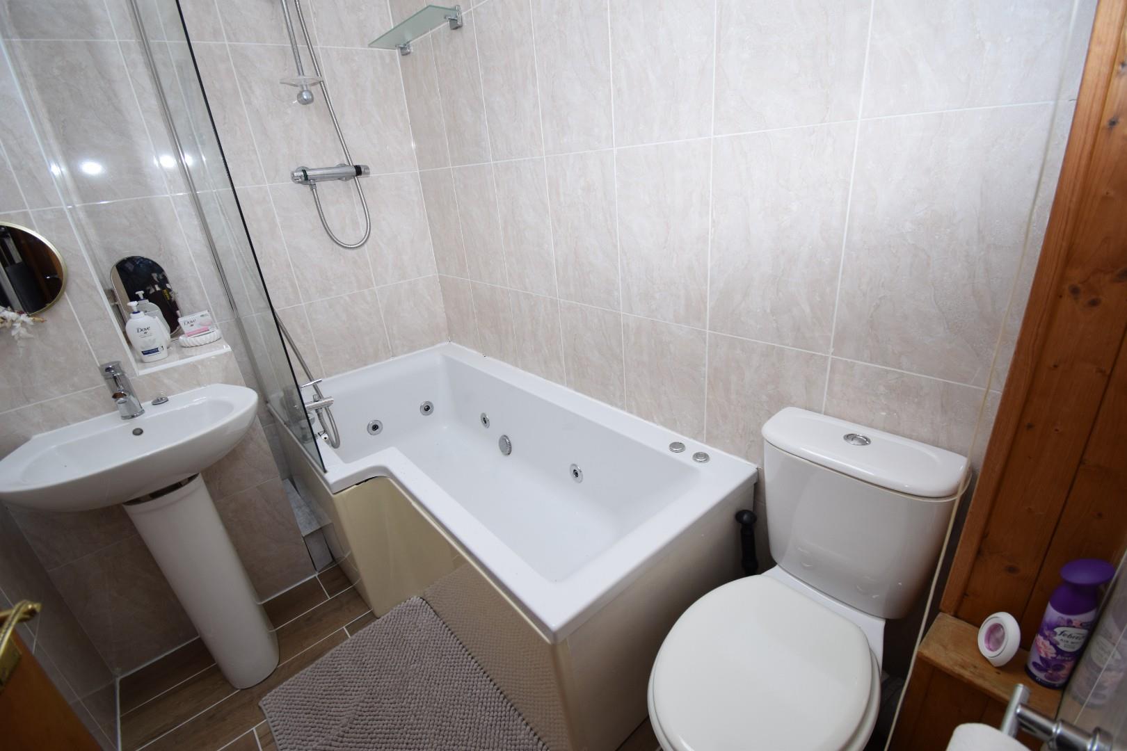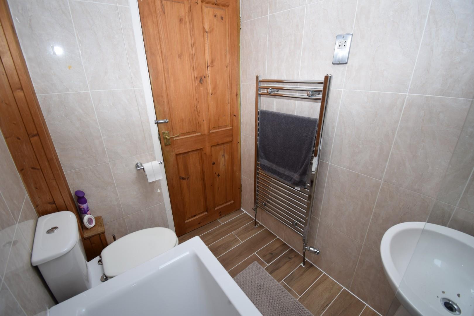 with tiled flooring & tiled walls; L-shaped bath with overhead shower and shower screen; pedestal sink basin; low level WC; heated towel rail; skylight.