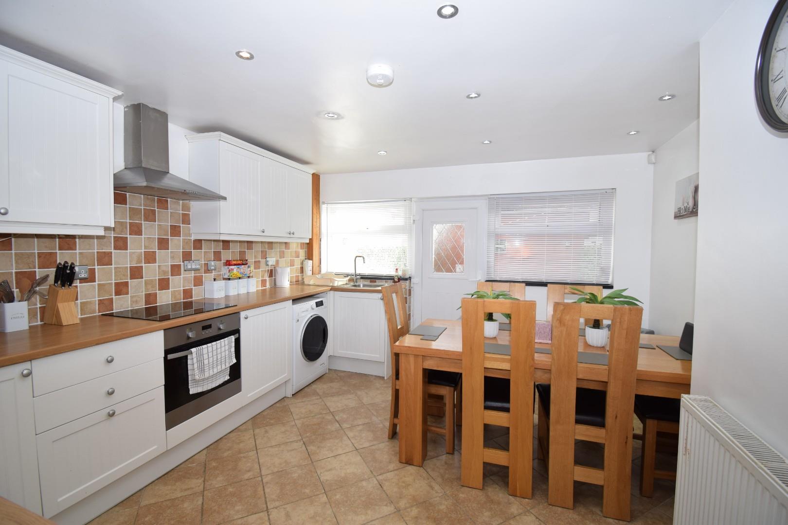 with tiled flooring & part tiled walls; radiator; a range of wall & base units with worktop over; integrated oven with extractor over; space & plumbing for washing machine; space for free standing fridge/freezer; door to rear garden.