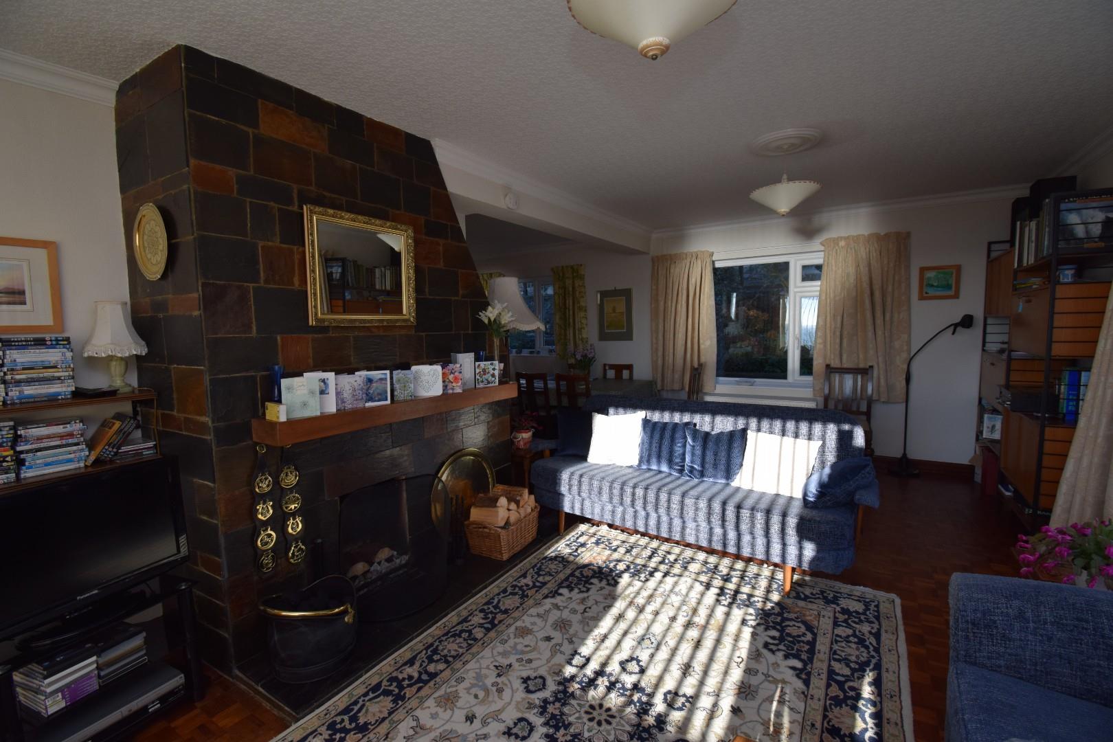 with 'L' shaped layout featuring 'French' doors to the side of the house giving access to the garden; large picture window to the front enjoying far reaching sea and Castle views; open fire set within green slate clad fireplace and parquet flooring