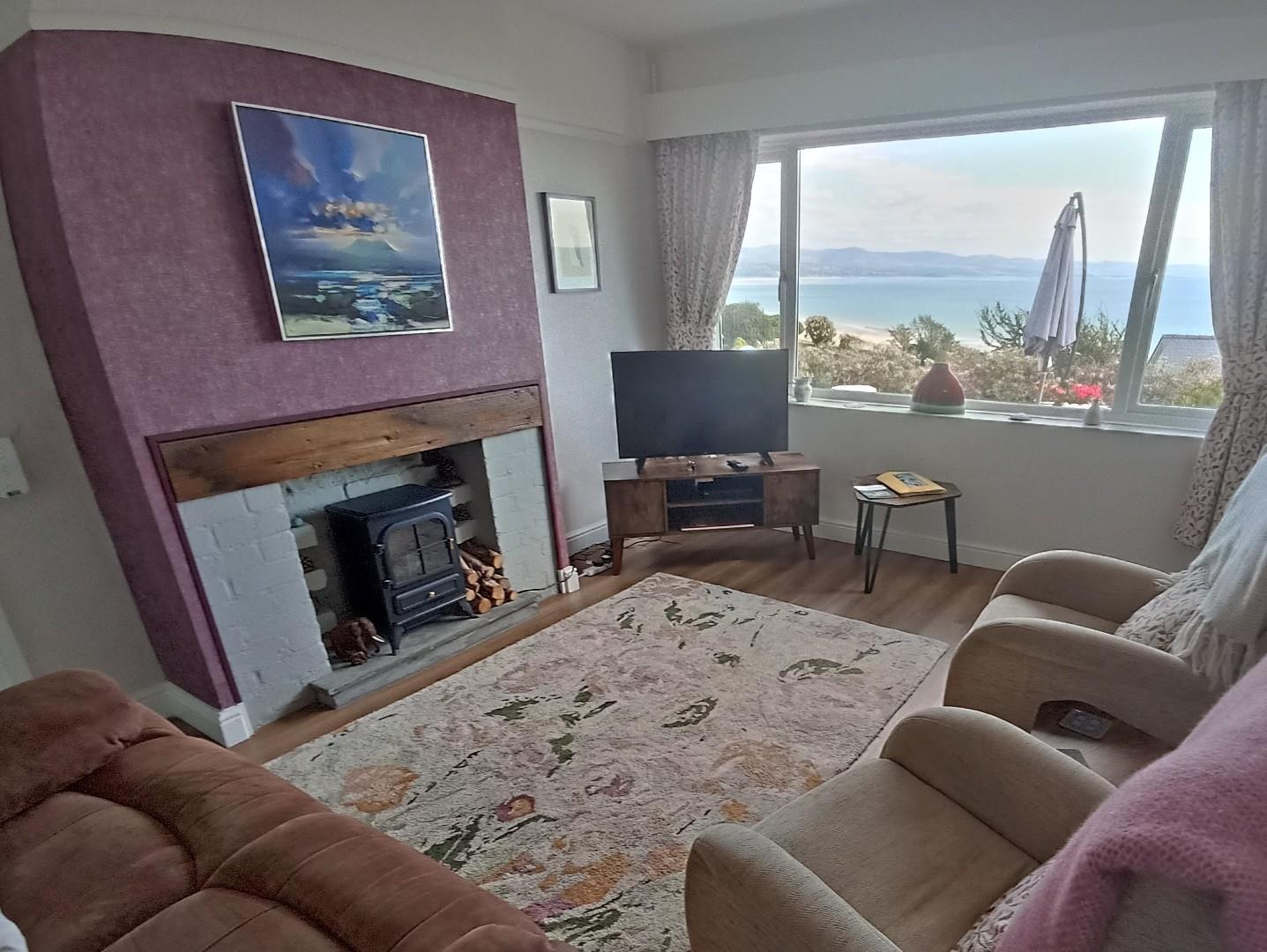 with 'wall to wall' picture window to the front enjoying stunning sea & mountain views; brick fireplace with electric log burner effect fire; timber effect LVT flooring and radiator