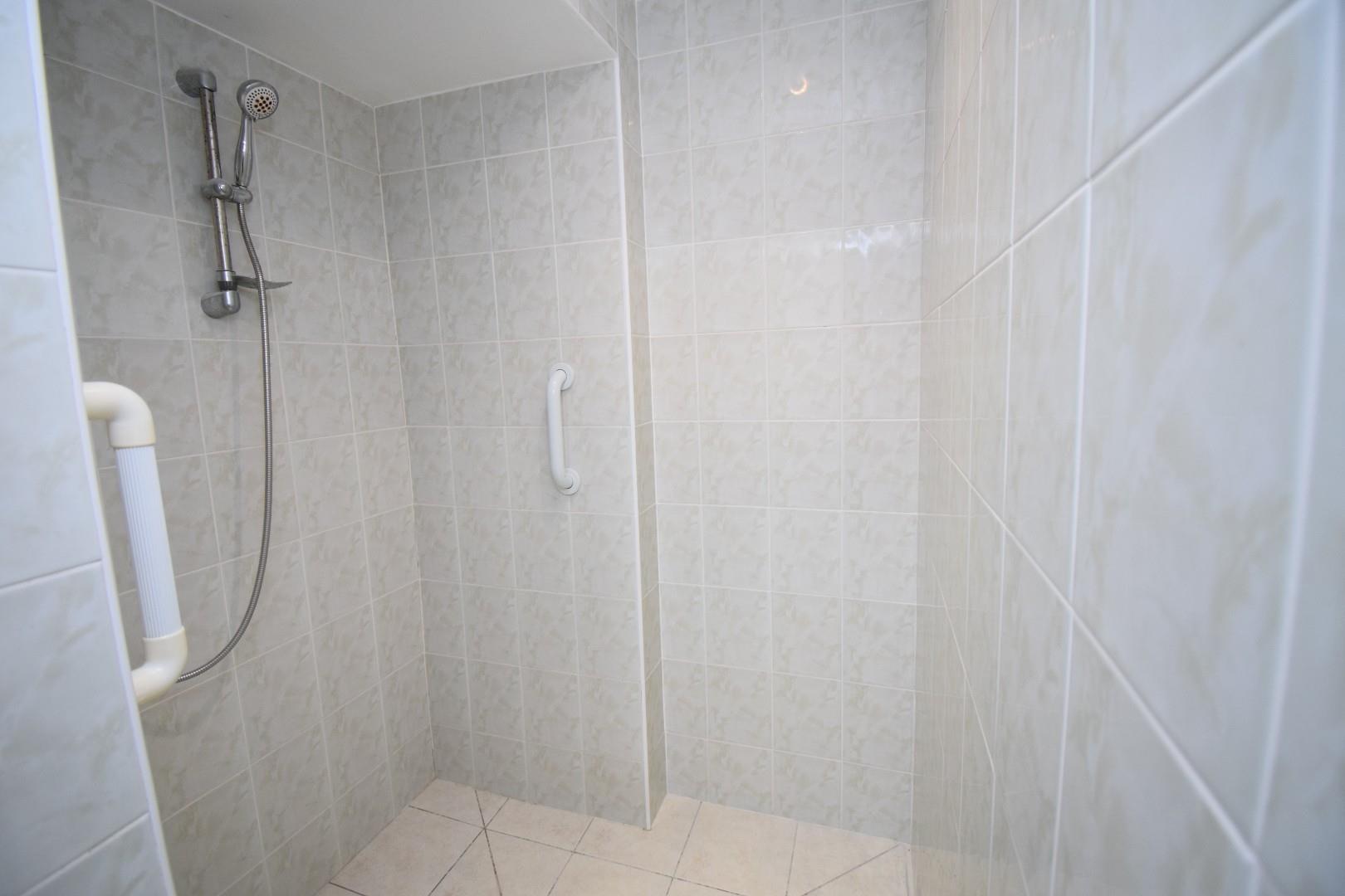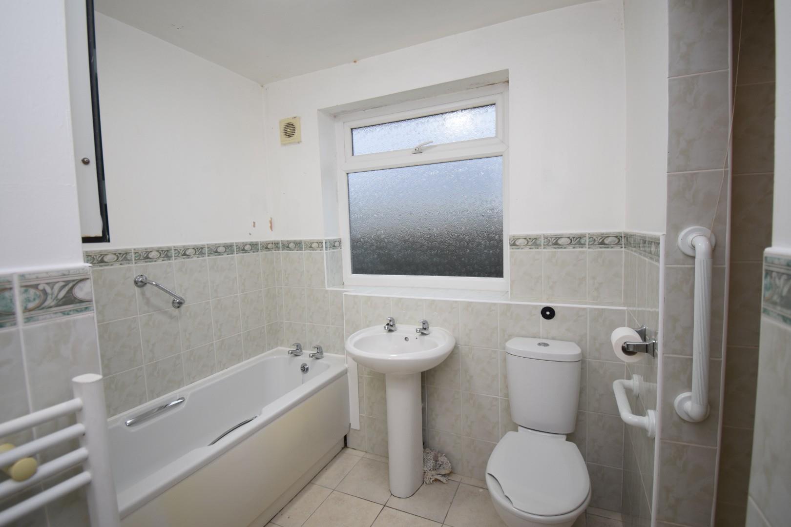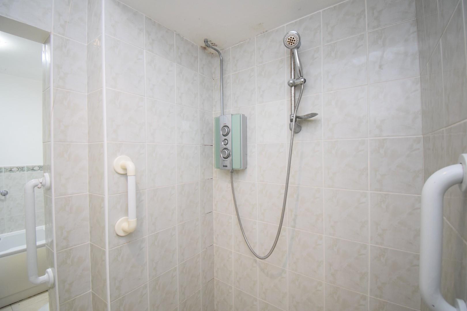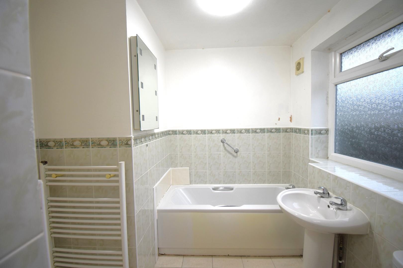 With panelled bath, wash hand basin, wc, heated towel rail, part tiled wall and access to a fully tiled shower/wet room.