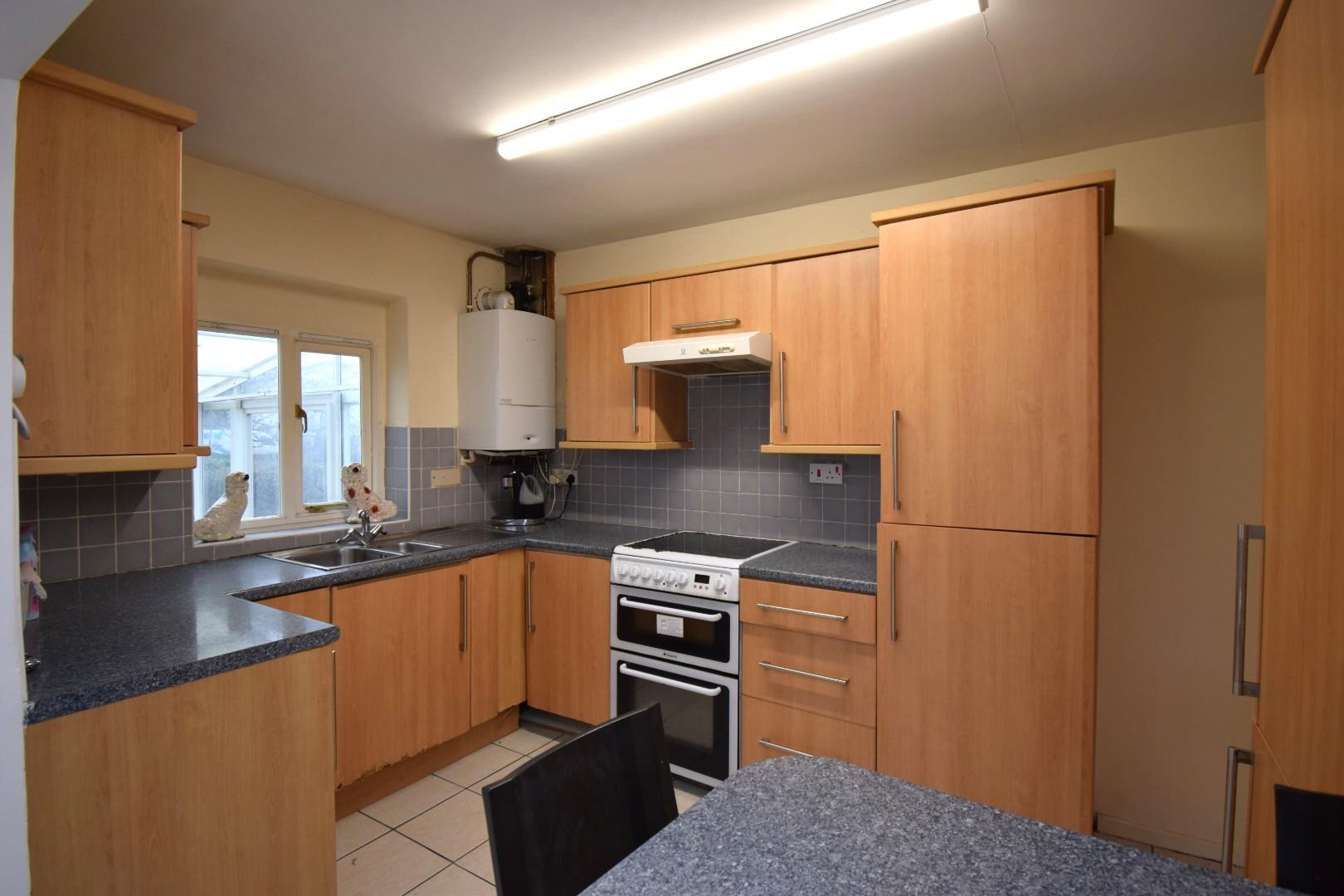 Open plan, with hot and cold stainless steel sink unit, matching wall and base units with worktops, wall mounted Worcester boiler supplying the domestic hot water and central heating system, partly tiled walls, built in fridge freezer.