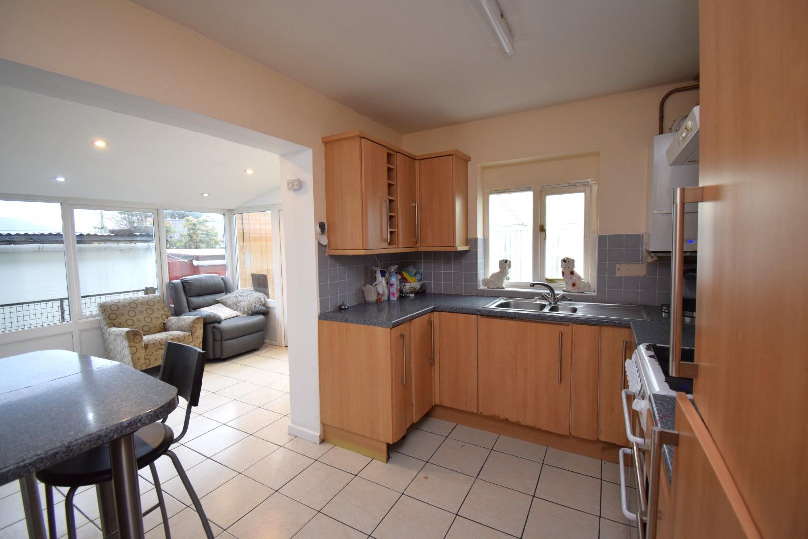 With hot and cold stainless steel sink and plumbing for automatic washing machine. Sliding door out to rear garden area.