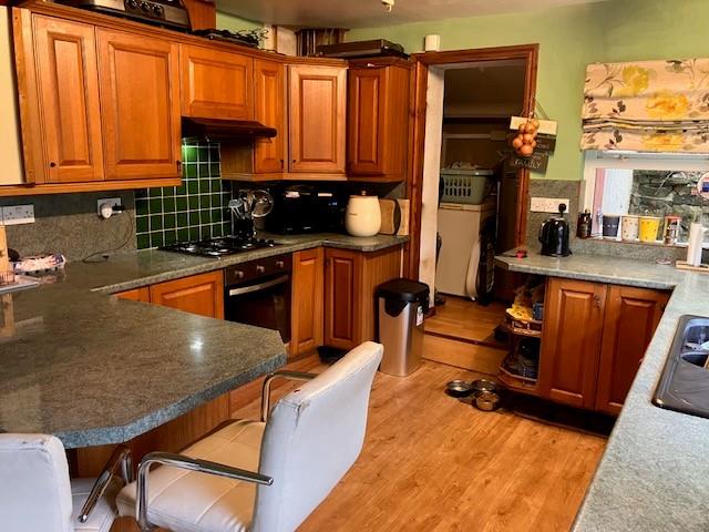 With matching wall and base cupboards, Gas hob, partly tiled wall, with hot and cold sink.