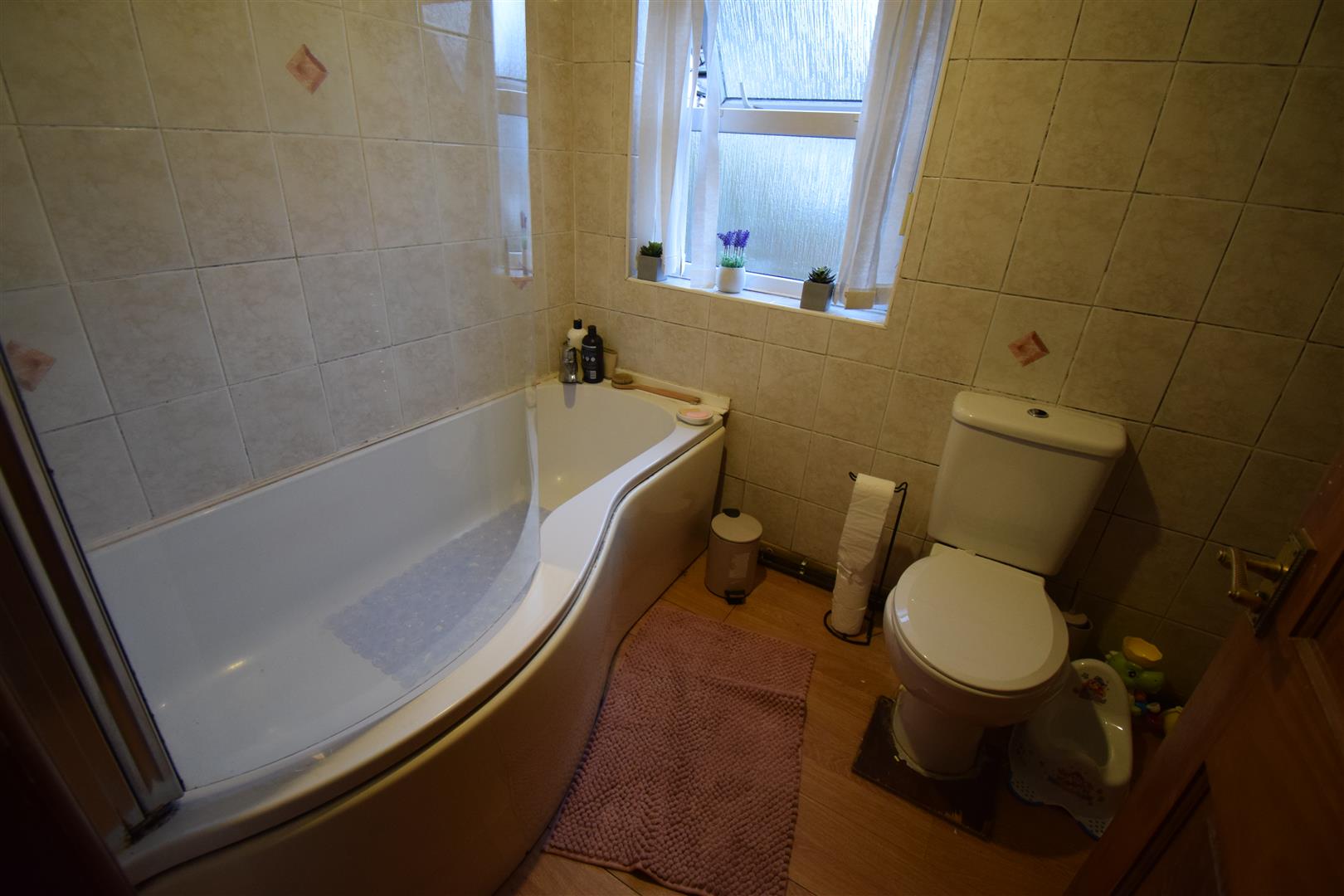 With a panel bath and shower, vanity unit sink and heated towel rail.