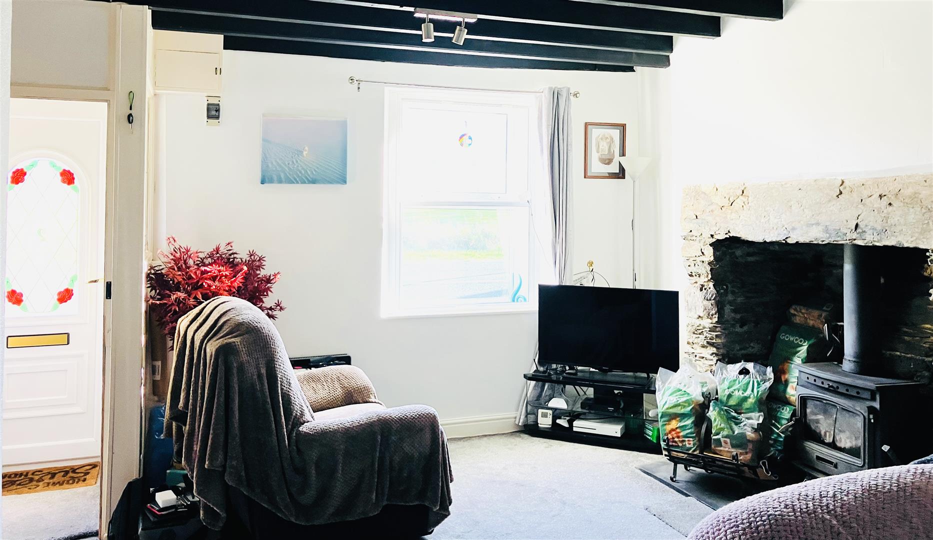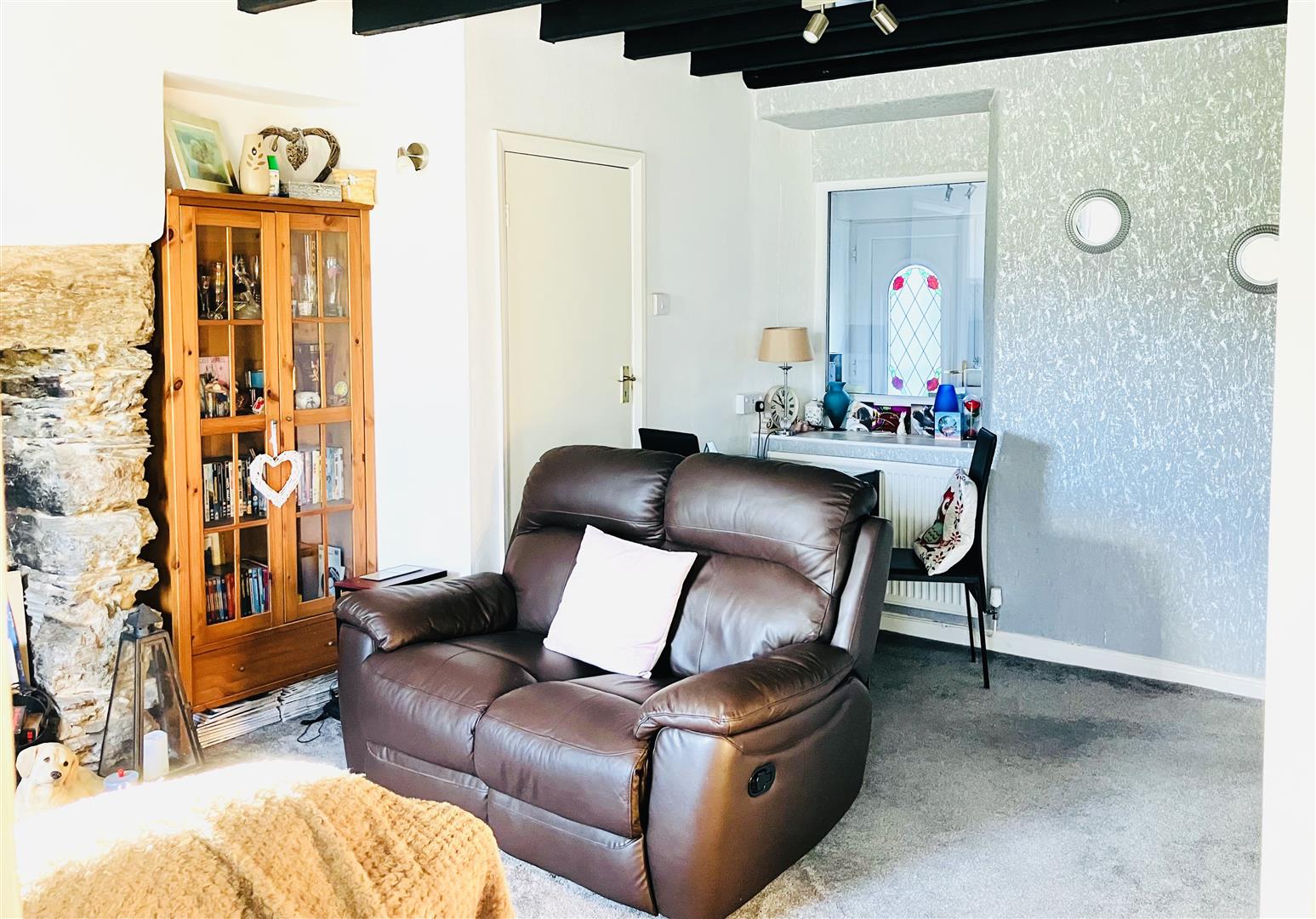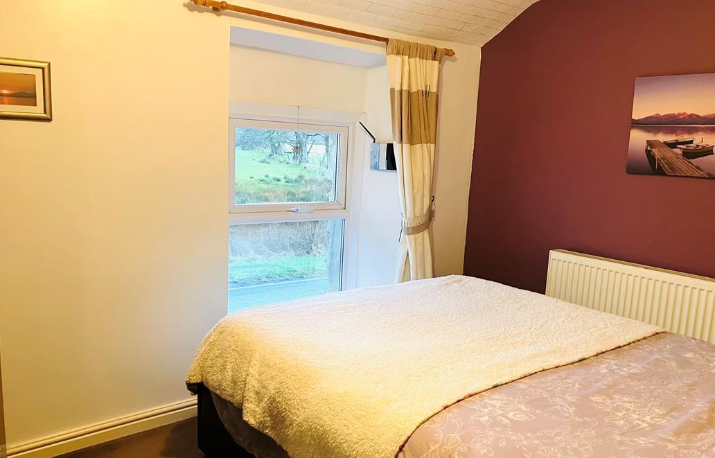 Spacious, newly carpeted, with high ceilings and radiator. uPVC window, also with secondary glazing and a beautiful view of farmland and beyond. Large stone inglenook fireplace with a log burner, is a wonderful feature, also includes glass fronted wall unit, curtains and light fittings.