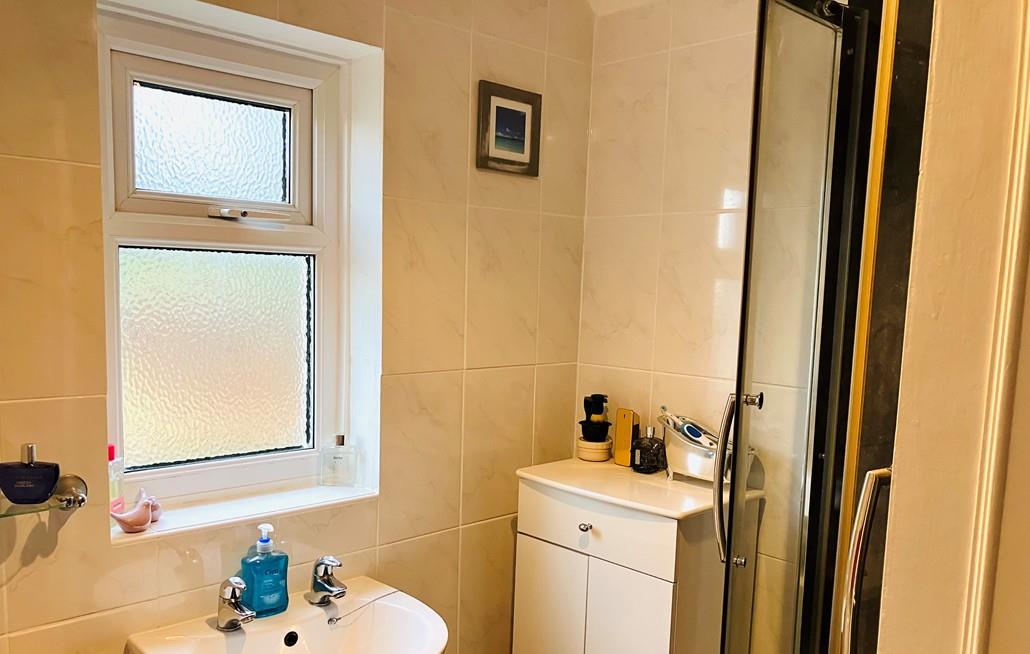 Large double shower unit with Mira Sport power shower, sink, W.C, radiator, uPVC window, towel rail, glass shelf and fitted light/heater.