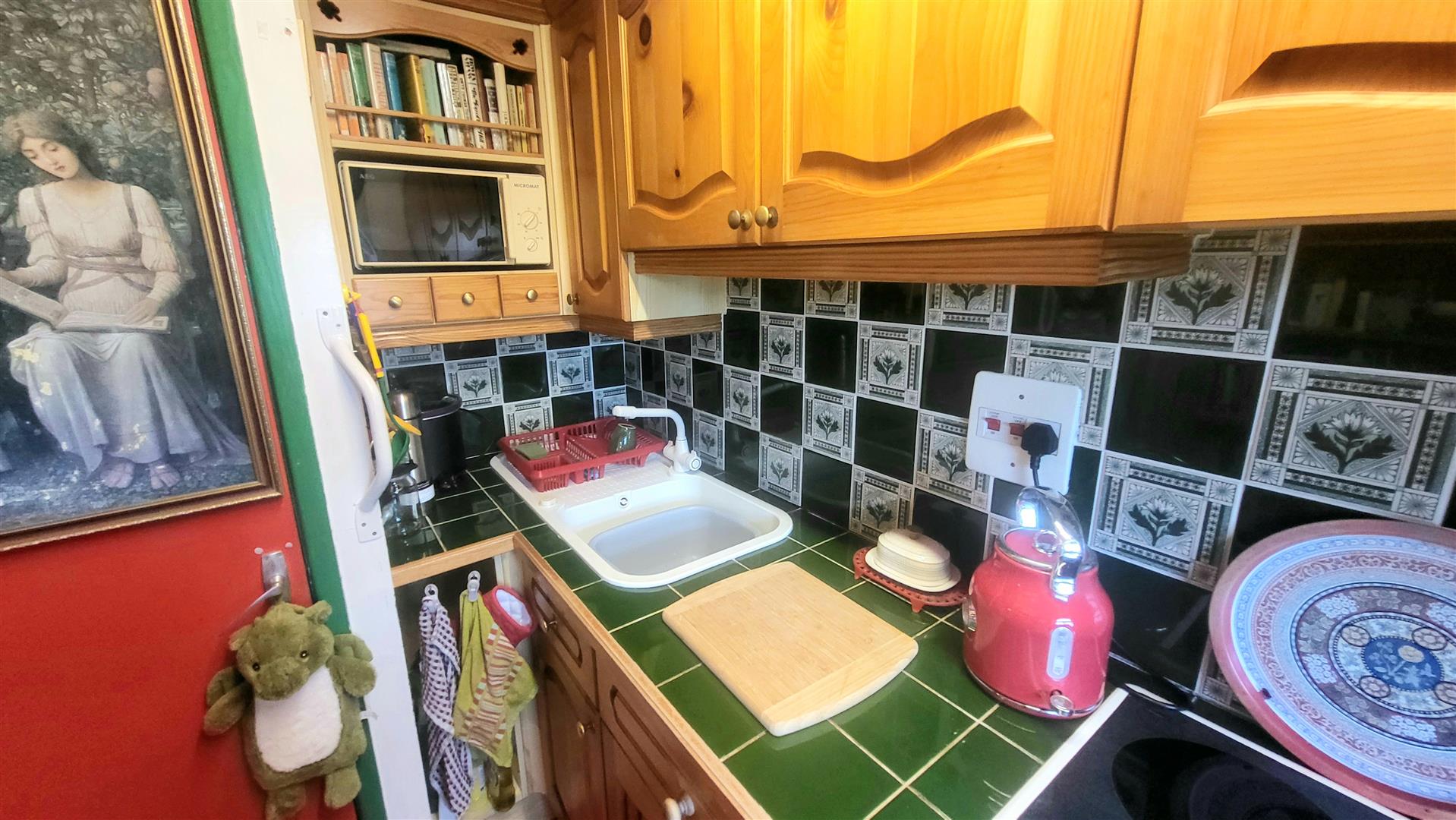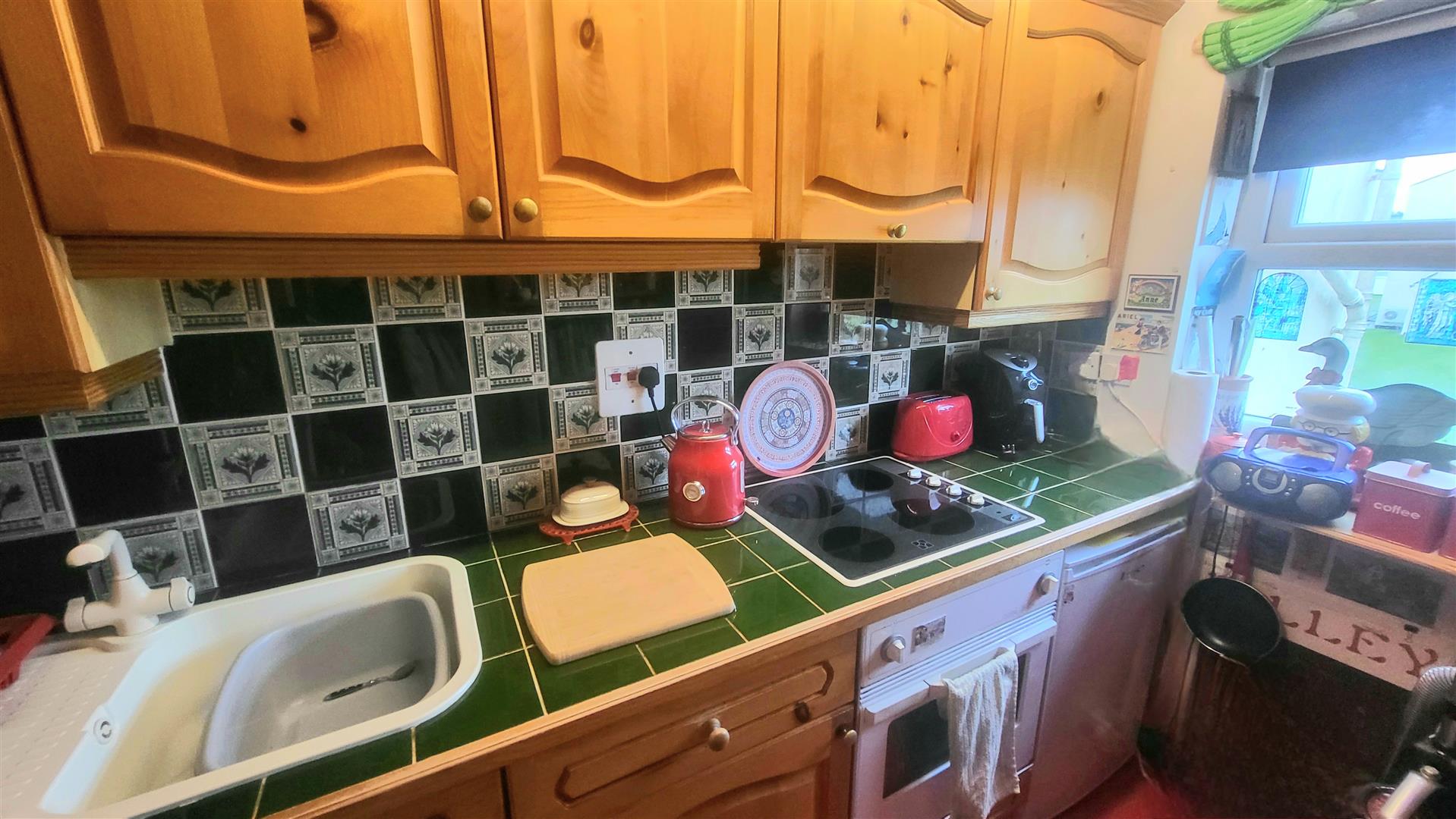 Window to rear aspect over looking communal gardens, fitted with a range of wooden wall and base units including integrated electric oven with hob and extractor hood above, sink and drainer unit, space for under counter fridge, tiled work tops, cupboard housing hot water cylinder