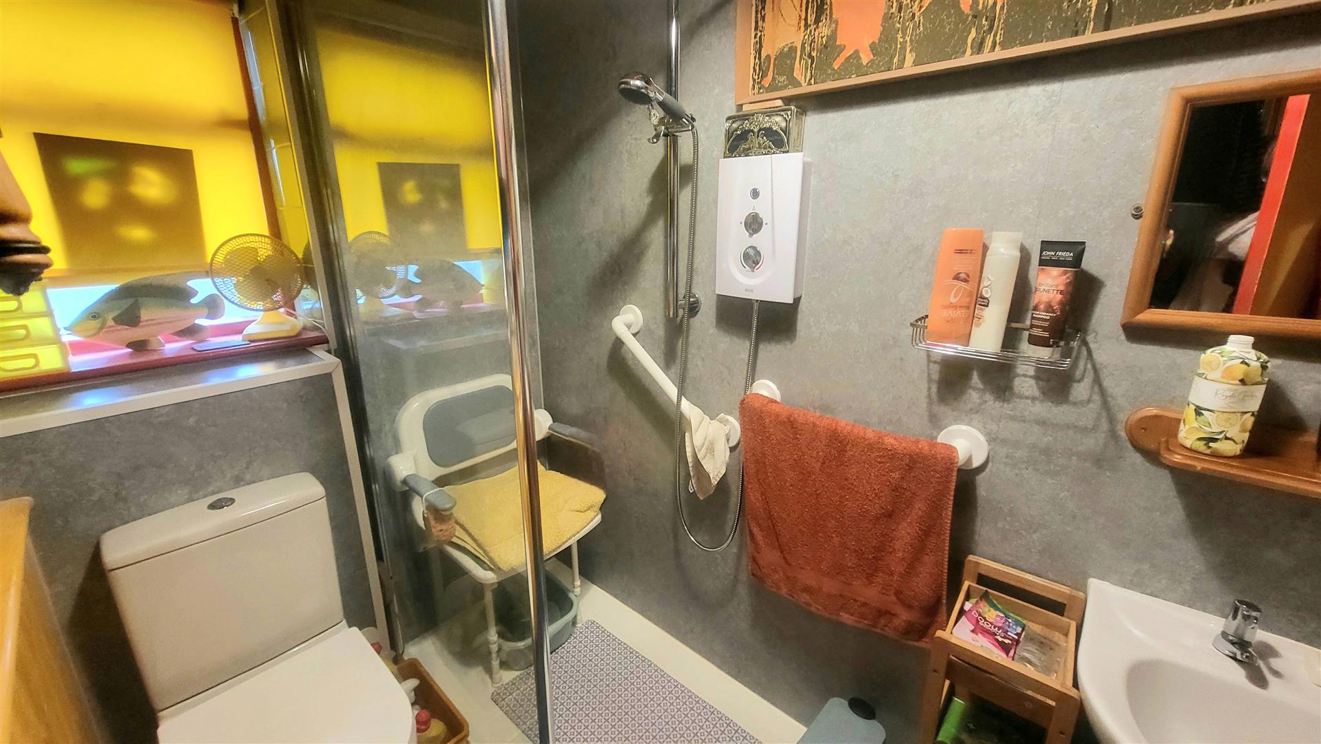 Window with modesty glass, walk in shower cubicle with electric shower, wash hand basin, low level w.c.,