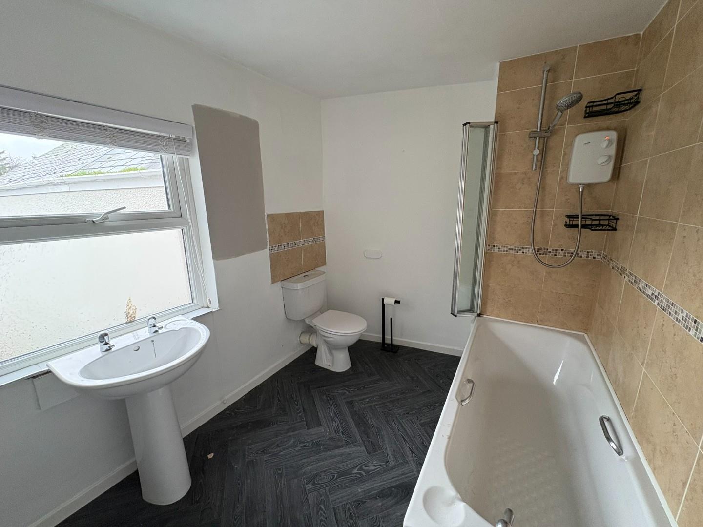with panelled bath with shower over; low level WC; pedestal wash basin; fitted airing cupboard and radiator
