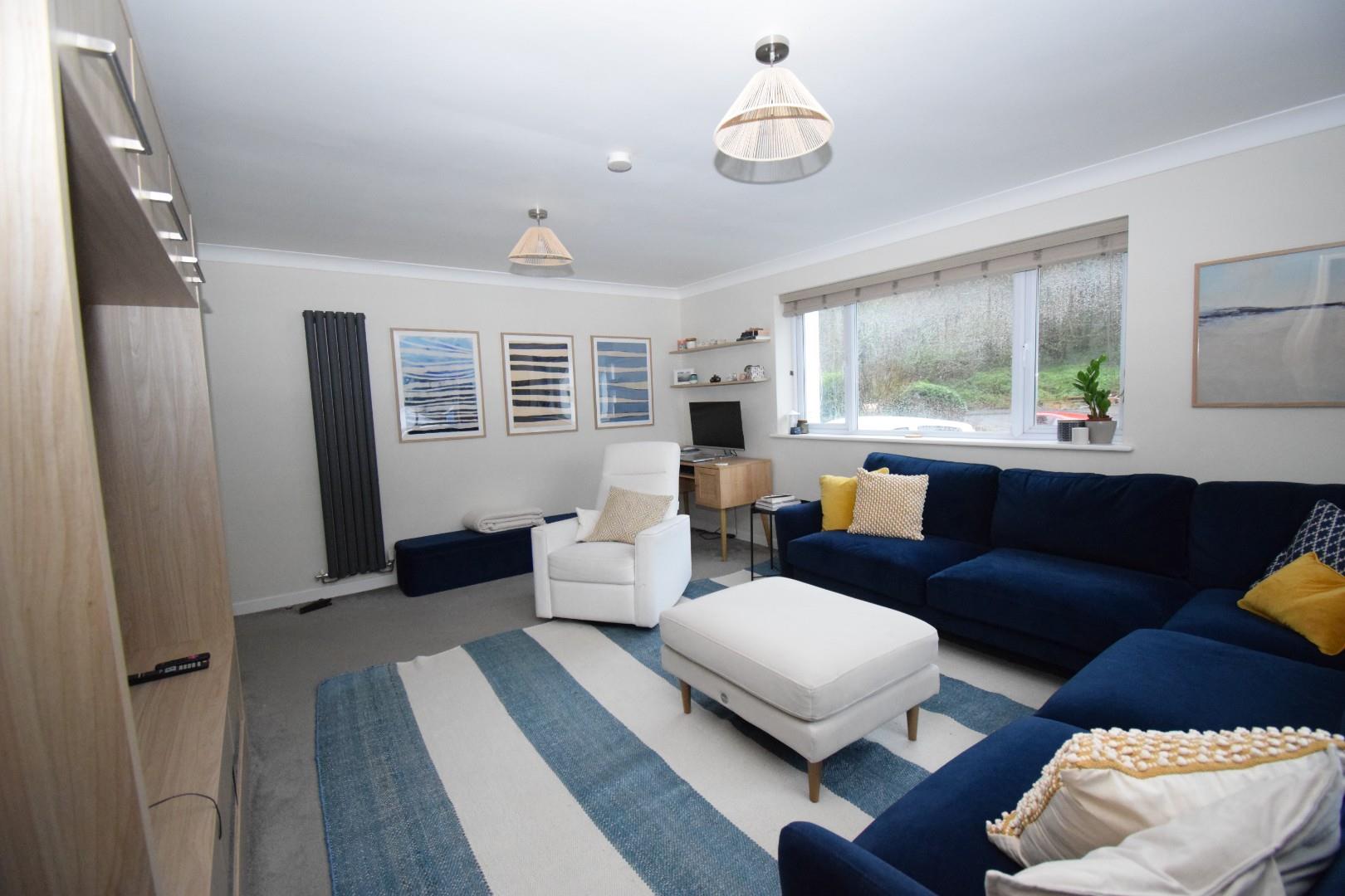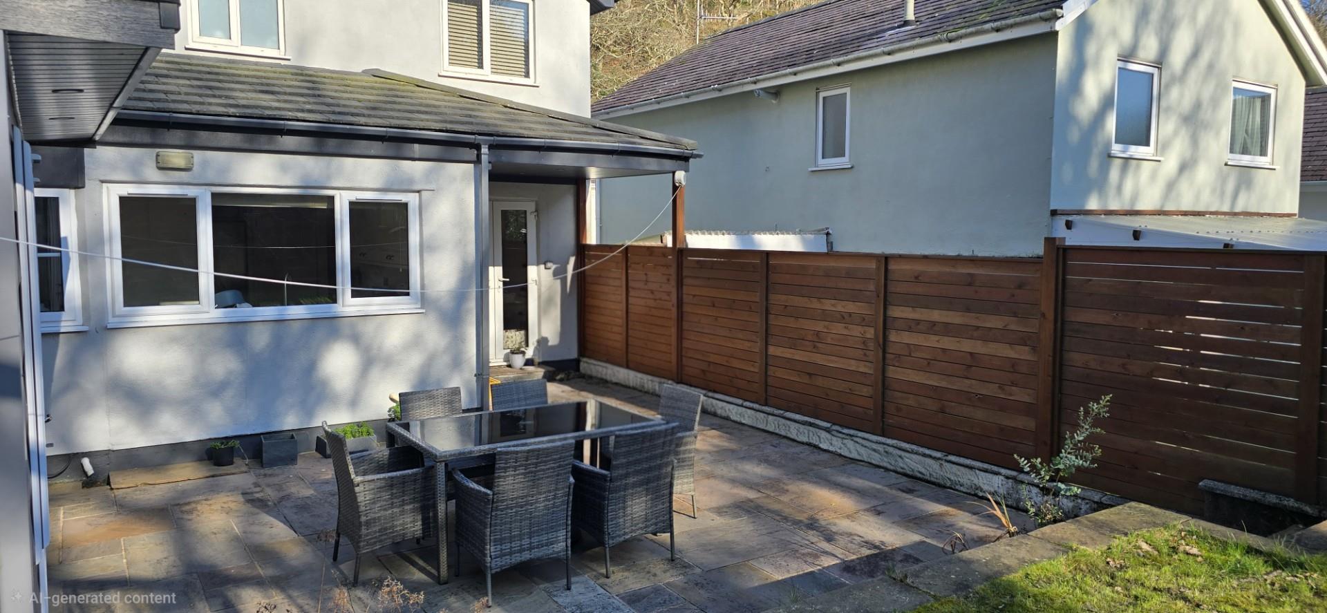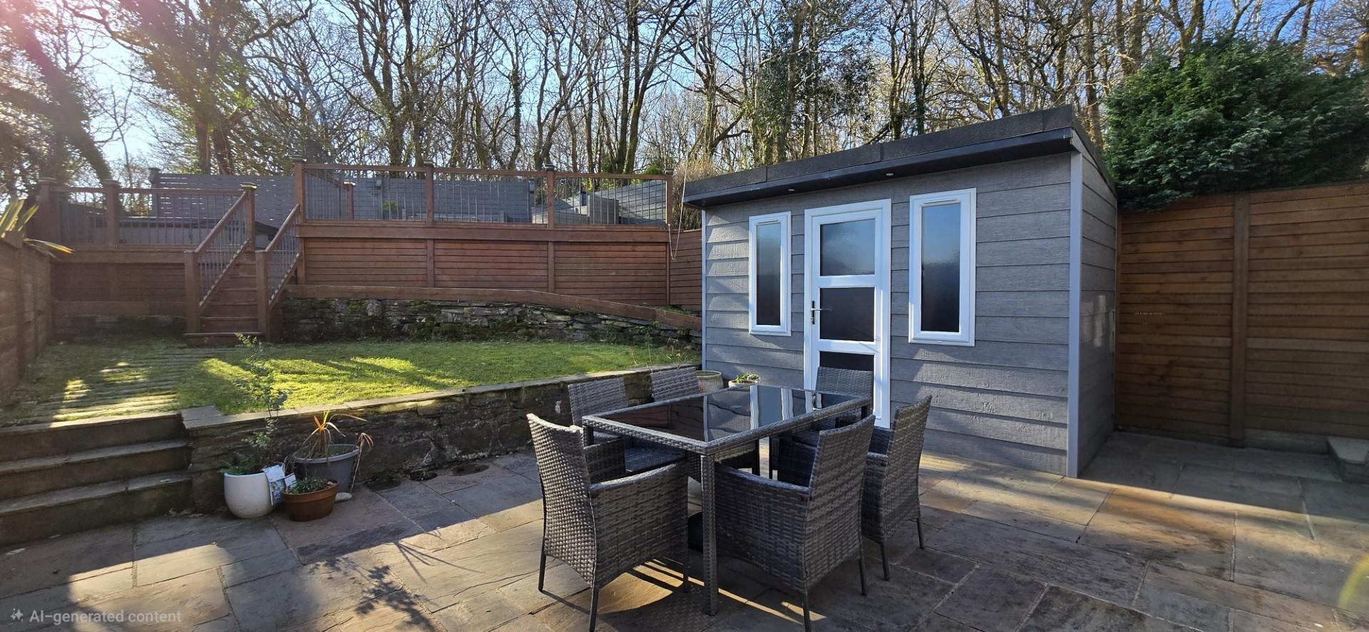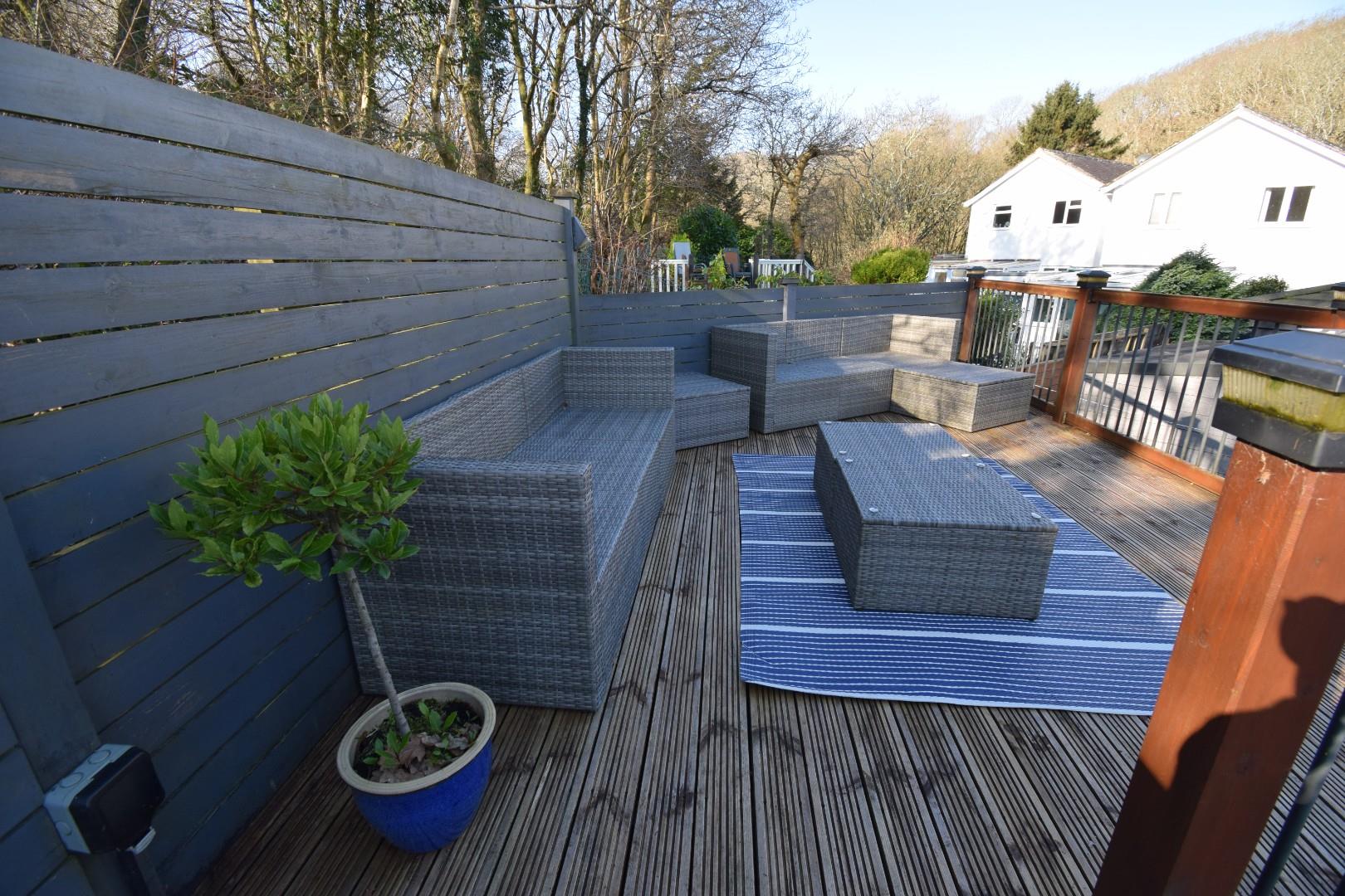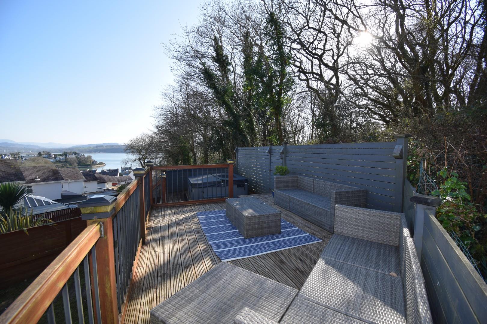 At the rear there is a spacious patio area, part covered, paved with slabs, also housing an outdoor shed/storage unit. Slightly up a level there is a lawned area of grass with a border of mature shrubs and plants. Above sits a decking area providing you with all the views needed. Far reaching sea views can be had from the seating area or the relaxing hot tub.