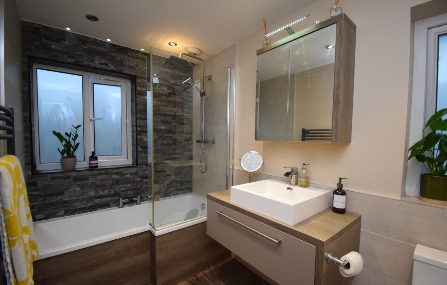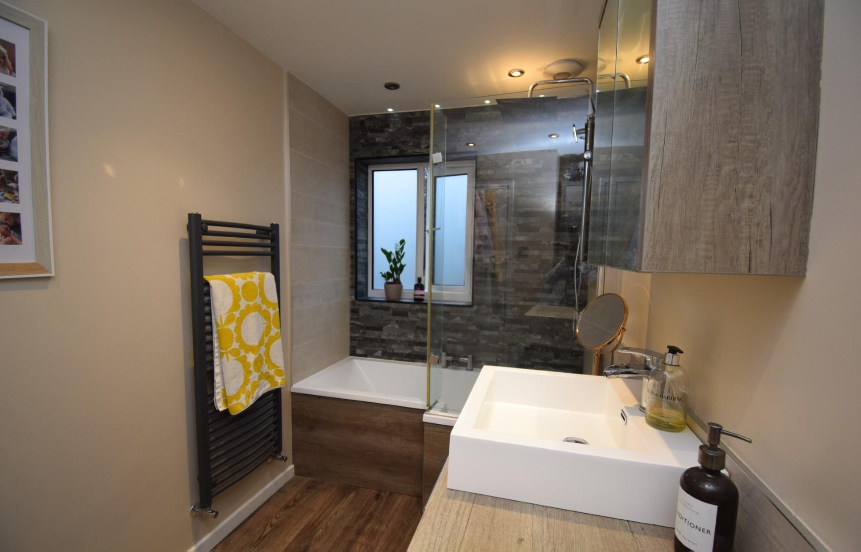 with oak flooring; part tiled walls; heated towel rail; L-shaped bath with overhead shower & screen; countertop sink fitted within vanity unit; low level WC; fitted alcove storage unit