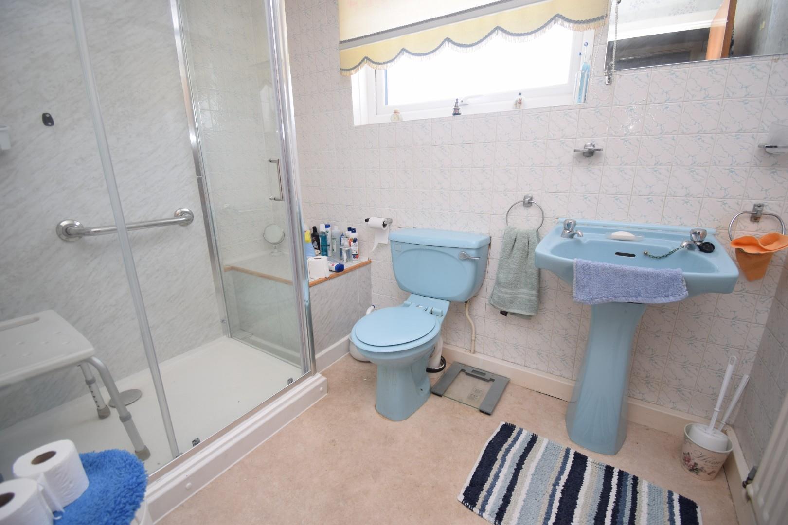 with large shower cubicle; low level WC; pedestal wash basin and radiator