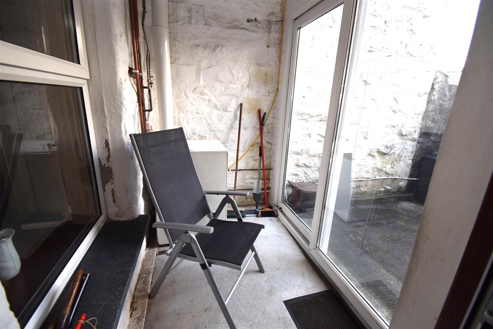 with hot and cold stainless steel sink, matching wall and base units, partly tiled walls, plumbing for automatic washing machine, 1 radiator, door out to rear porch with oil fired central heating boiler