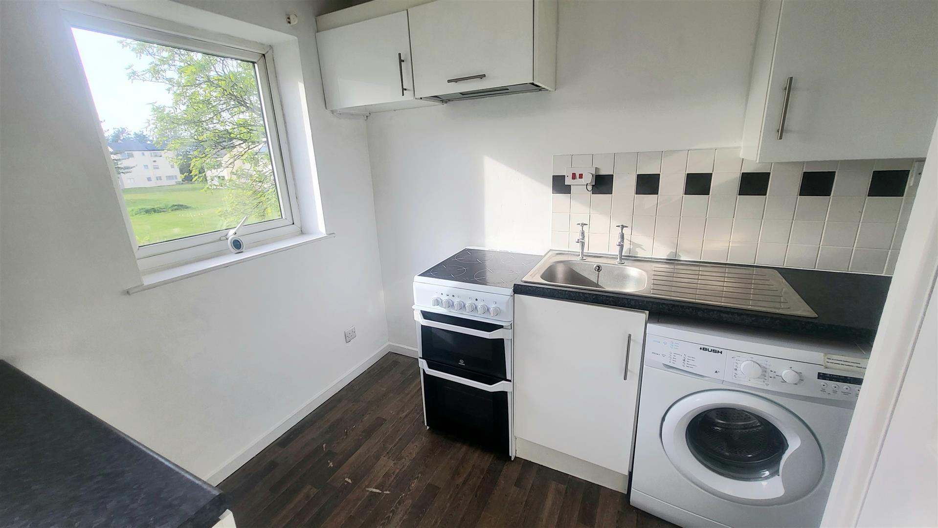 Linoleum floor, partially tiled, space for electric cooker with extraction hood over, plumbing for washing machine, stainless steel sink and drainer, white wall cupboards, white floor-standing cupboard, uPVC window to rear aspect.