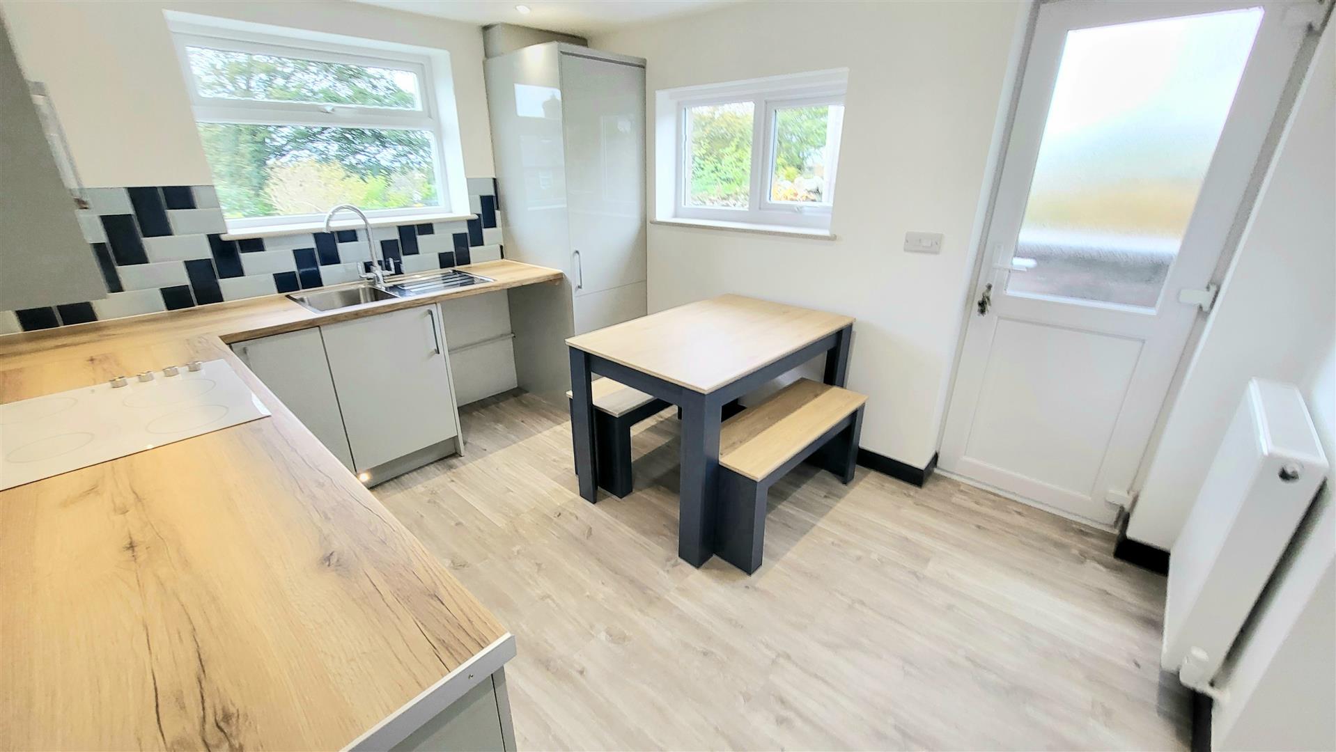 Vinyl flooring, partially tiled walls, radiator, modern pale grey floorstanding and wall-fixed units with oak worktops, feature lighting recessed within kickerboards, waste and recycling drawer, stainless steel sink and drainer, with contemporary mixer tap, white "Bosch" integrated electric hob, oven and extractor hood,, integrated "Caple" microwave, space for tall freestanding fridge/freezer, cupboard housing combination boiler, plumbing and space for washing machine, uPVC windows to front and side aspects, uPVC door to rear.