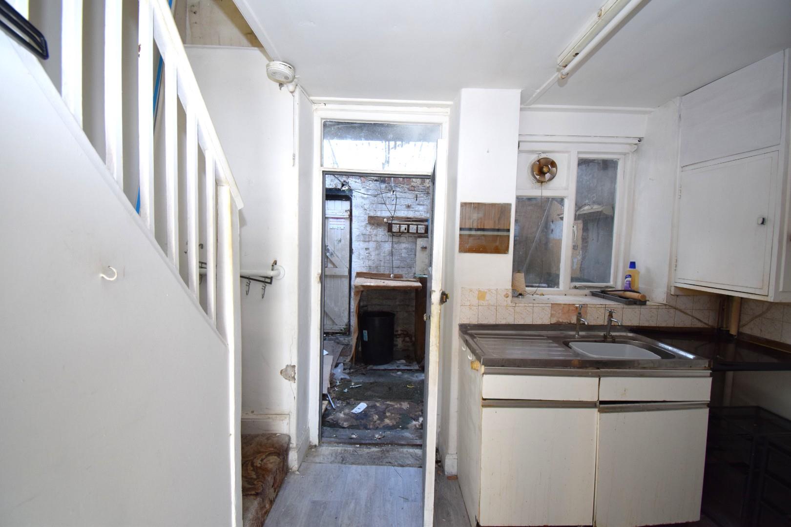 with hot and cold stainless steel sink, wall and base units, electric water heater and under stair cupboard. Door leading into:-